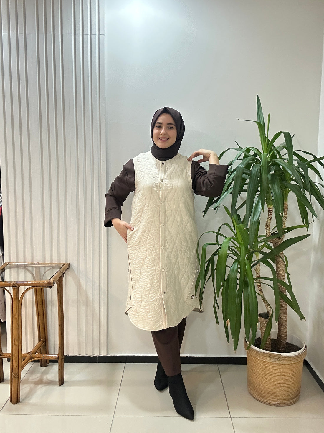 Dokuma Kapitone Yelek Krem Renk