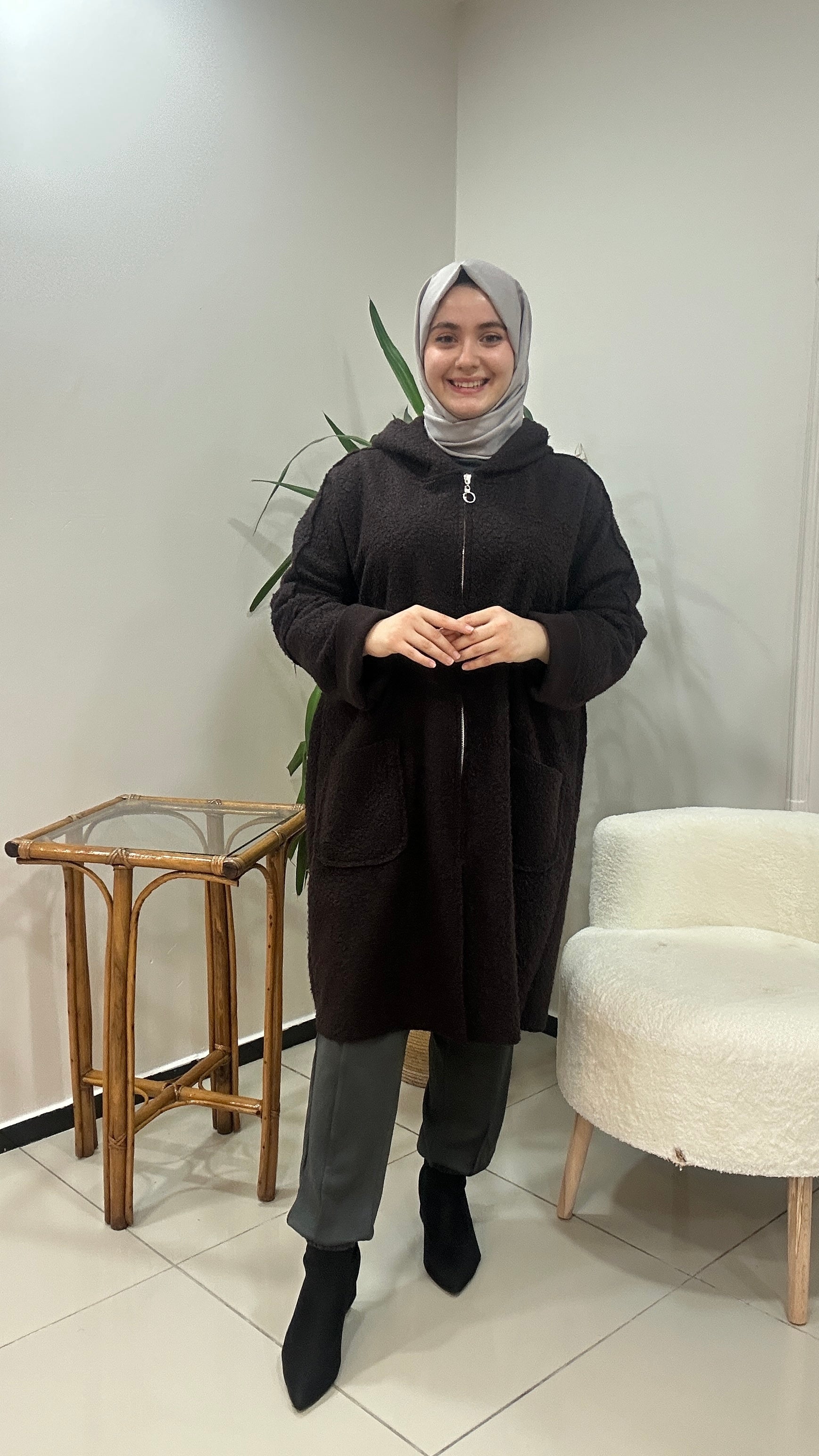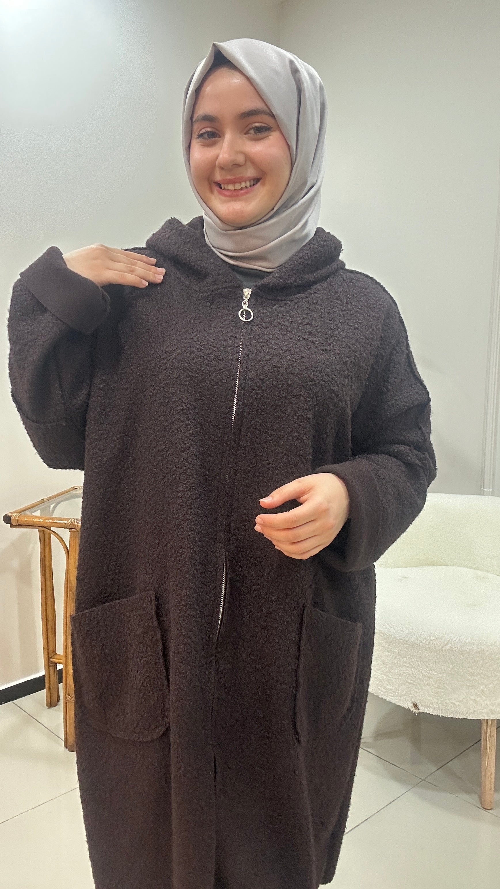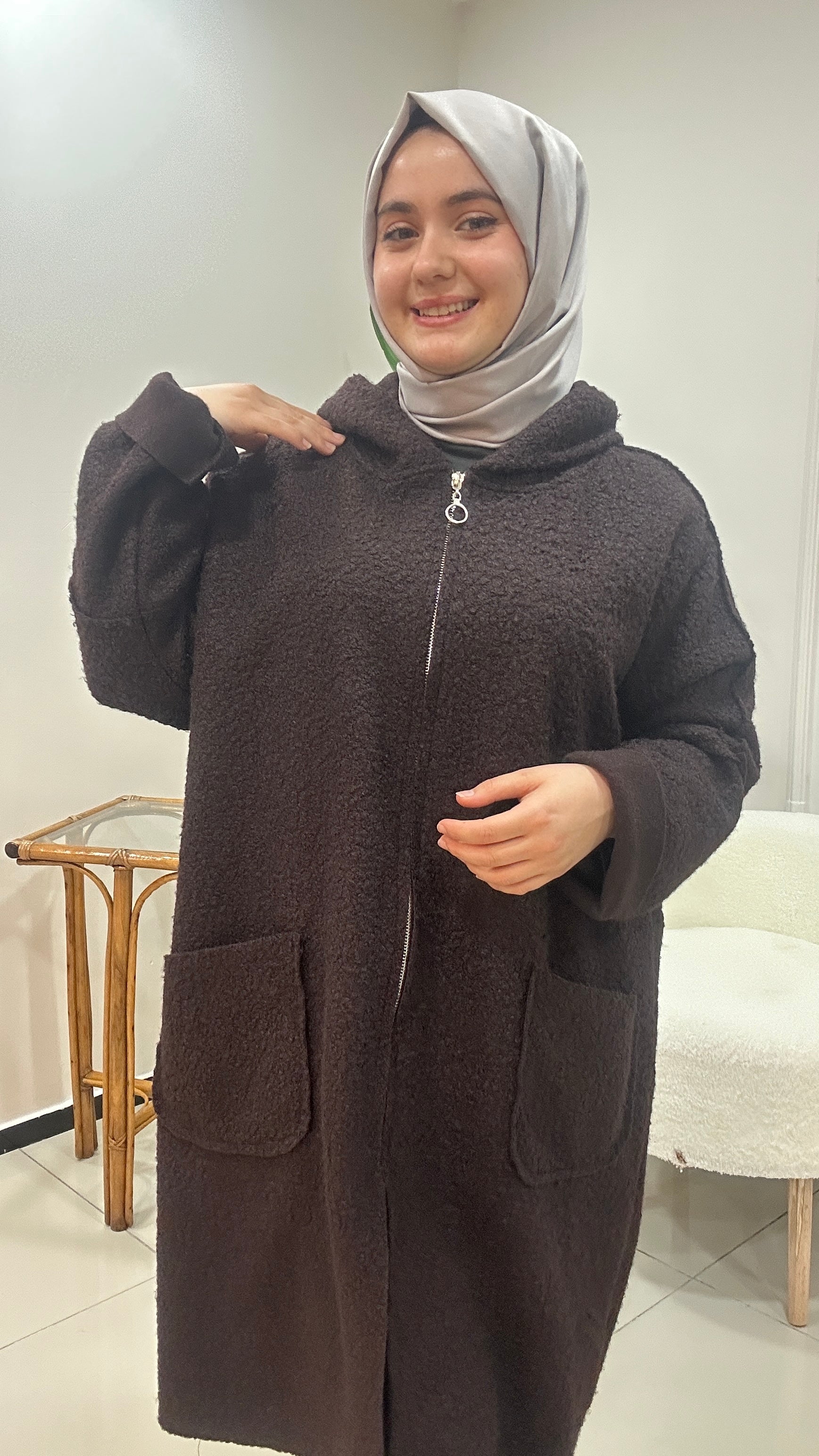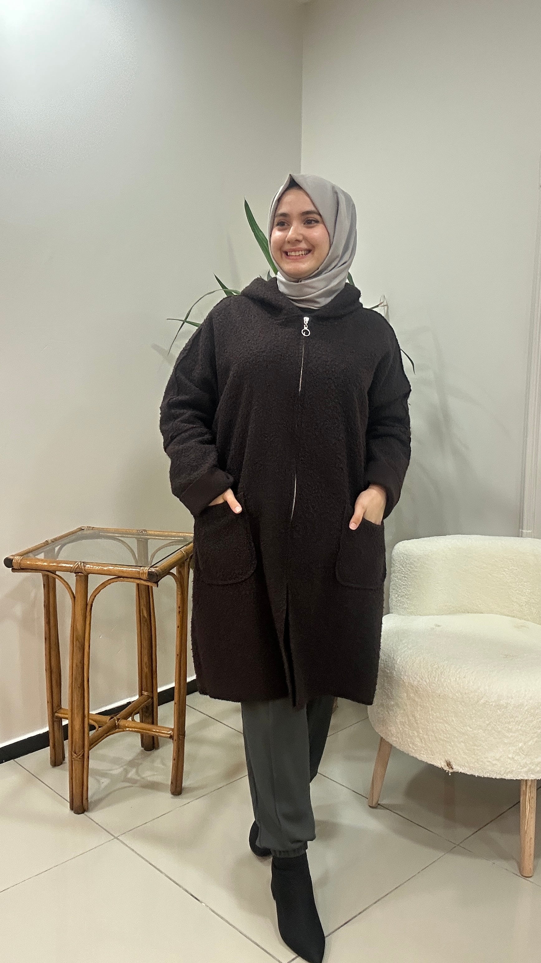 Kaliteli buklet kumaş. Fermuar kapamalı kapşonlu kap. Cepli astarsız ürün.