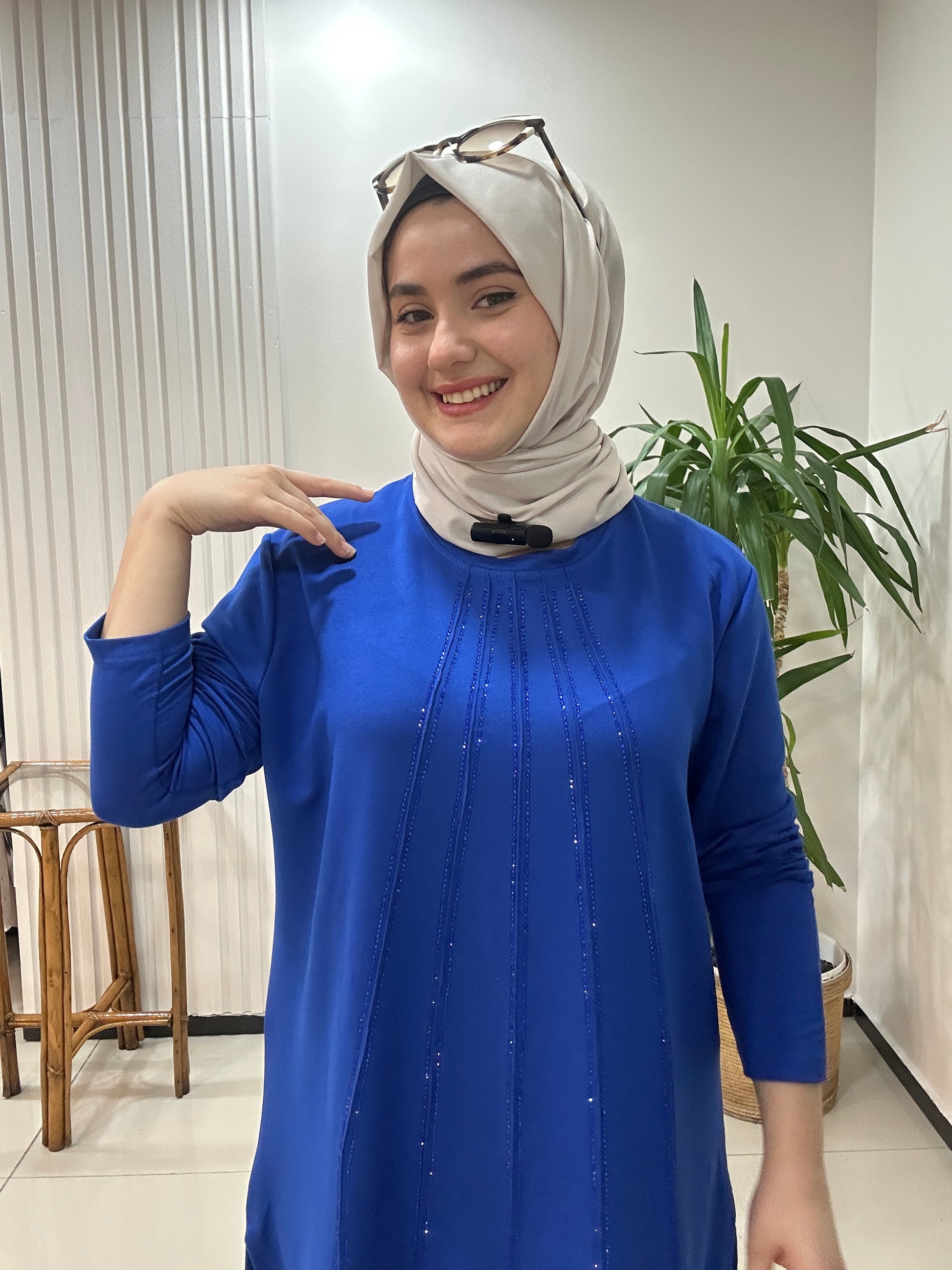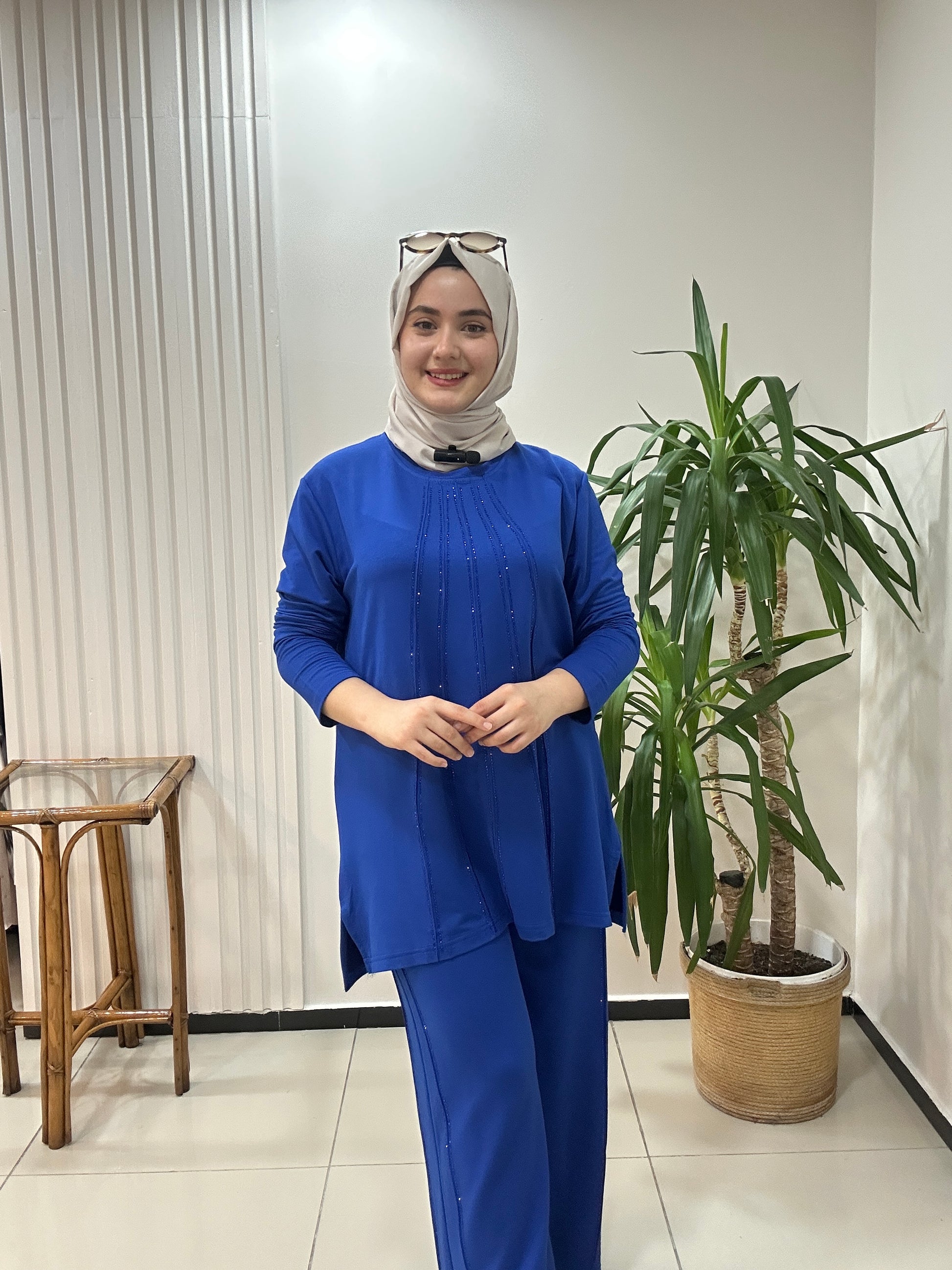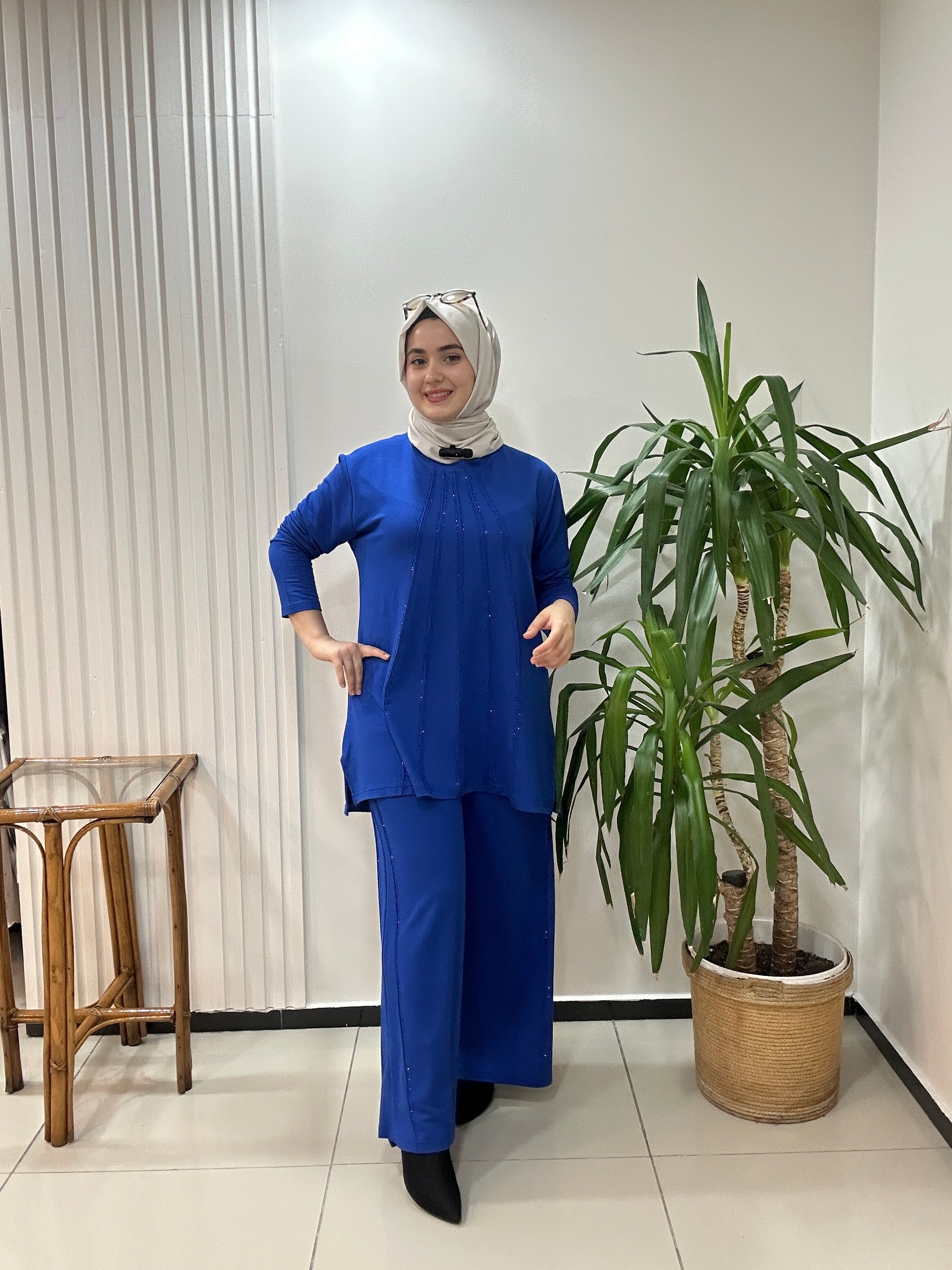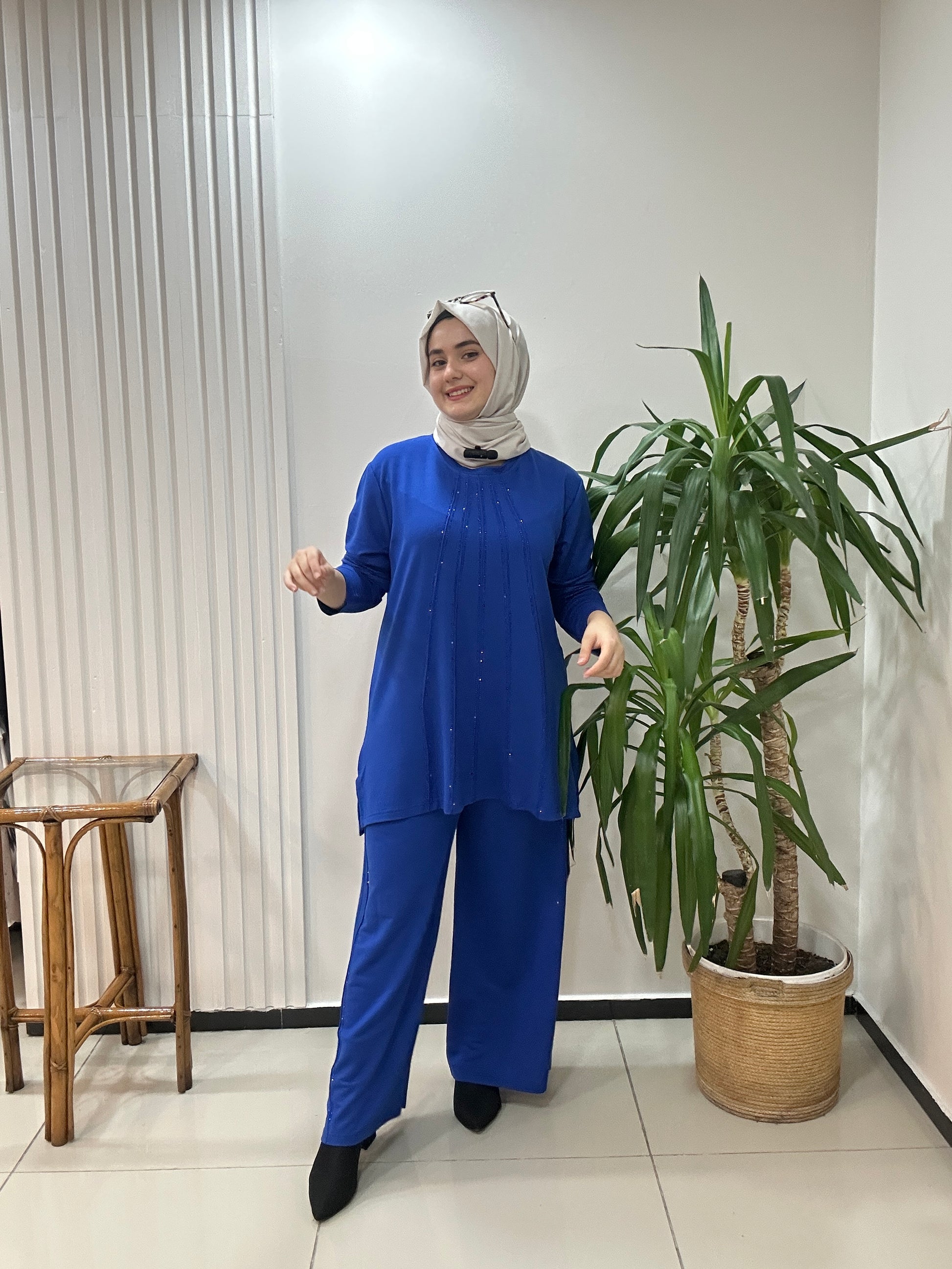 Büyük beden takım taş baskılı - saks
