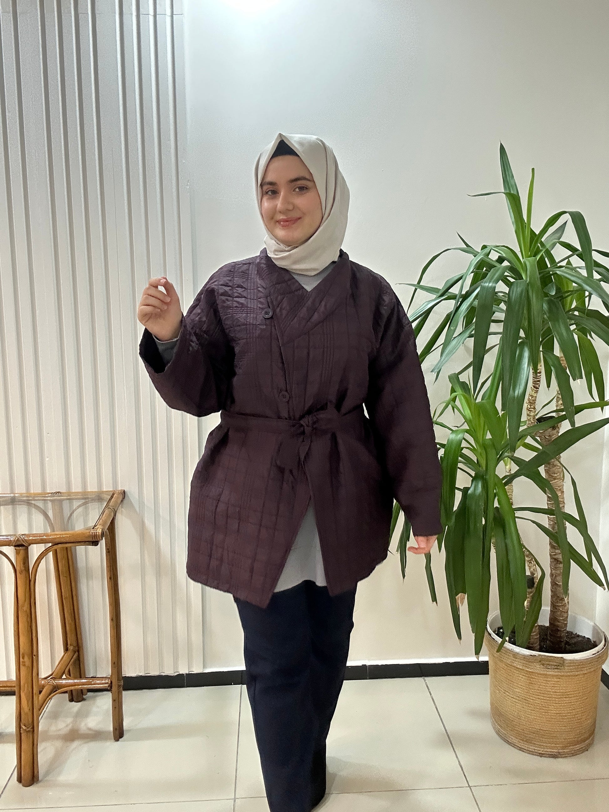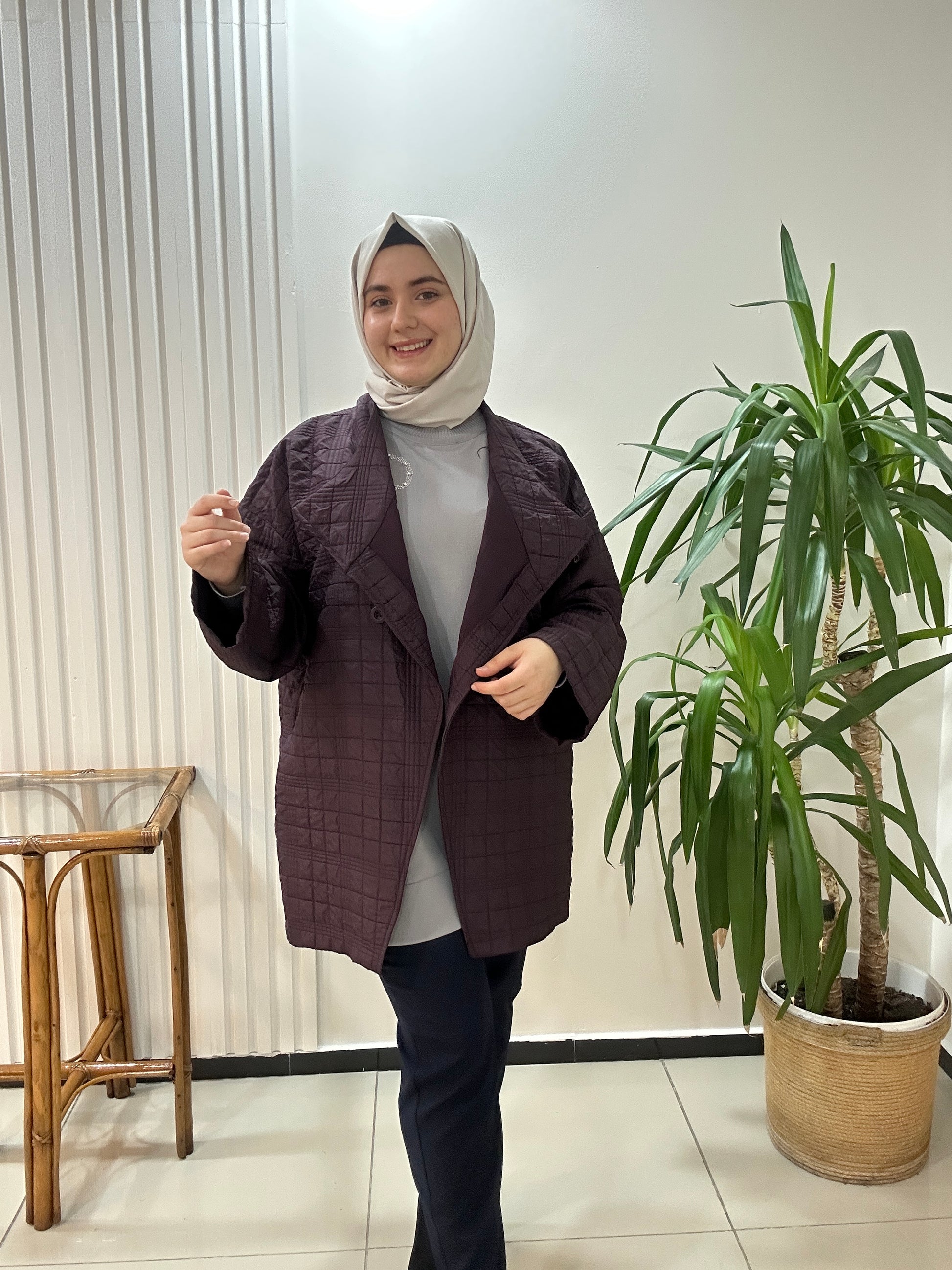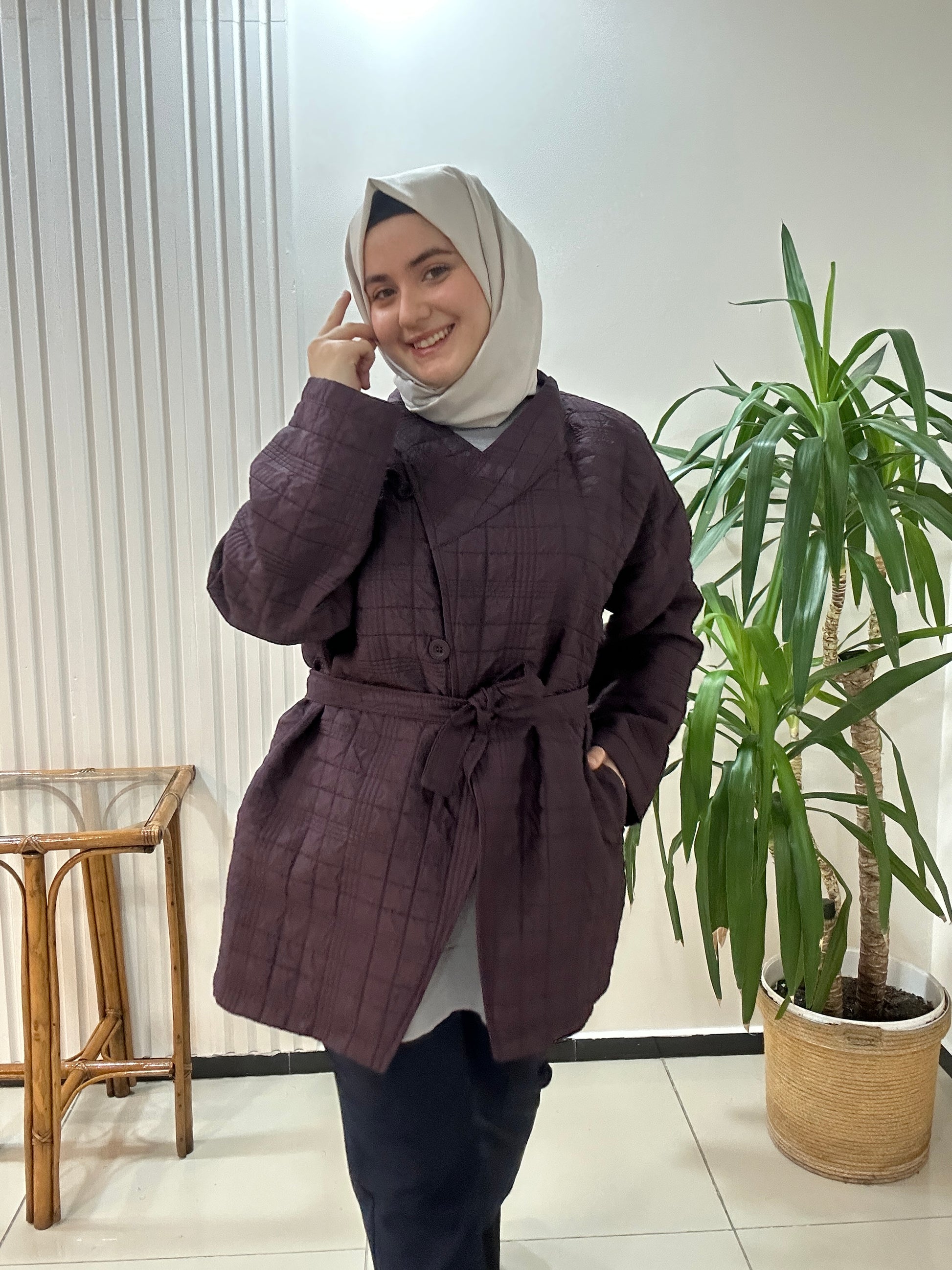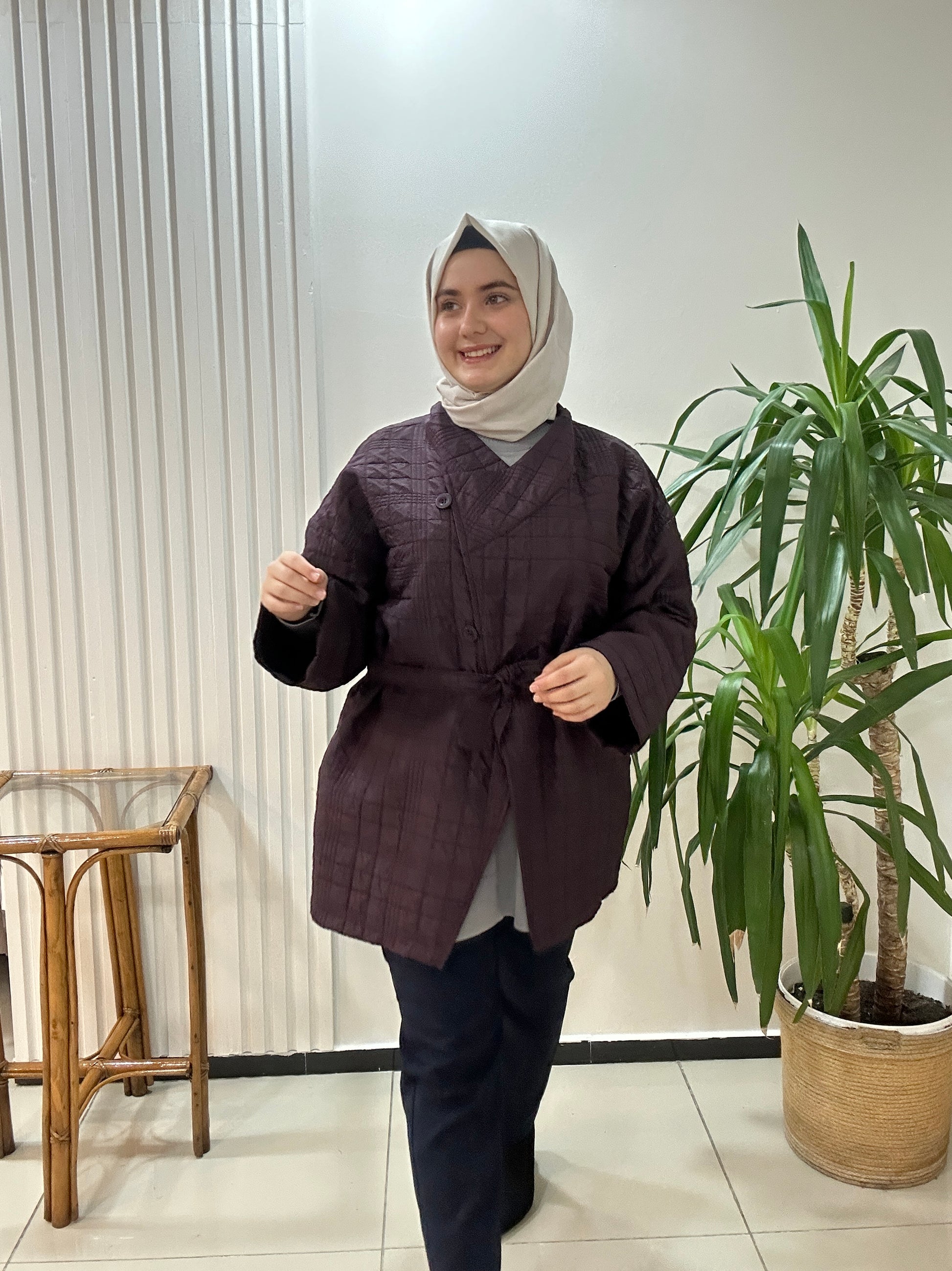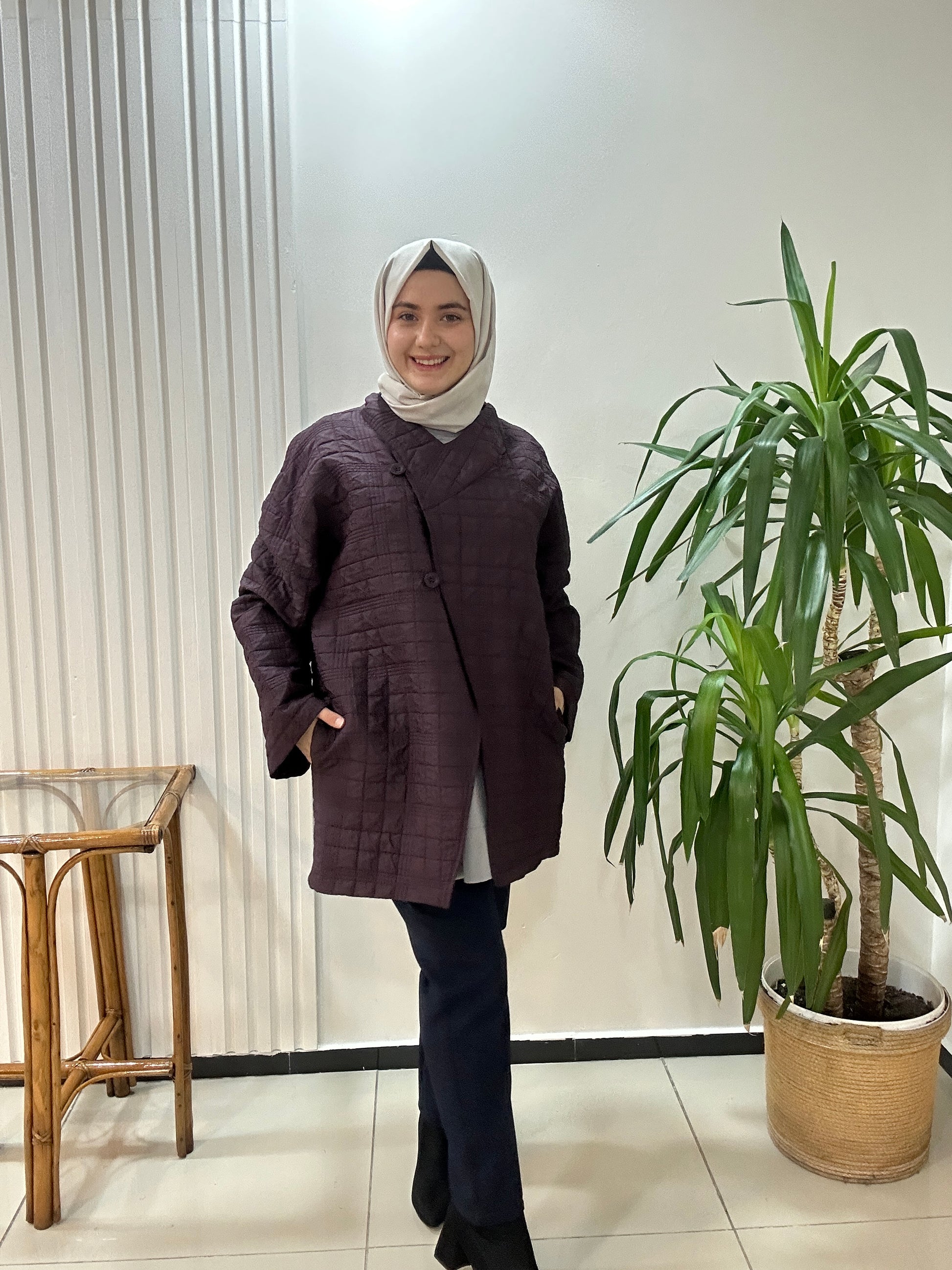 Dokuma kapitone kumaş. Geniş kalıp tarz bir ürün. 85 cm boy