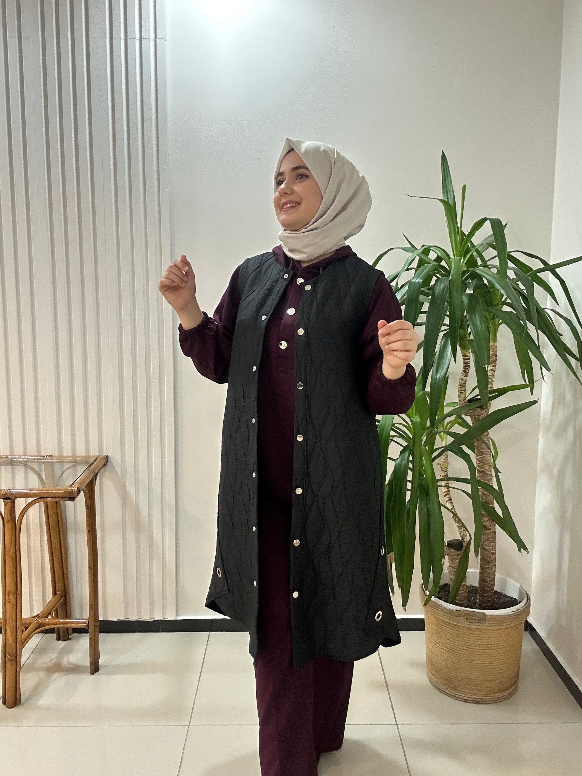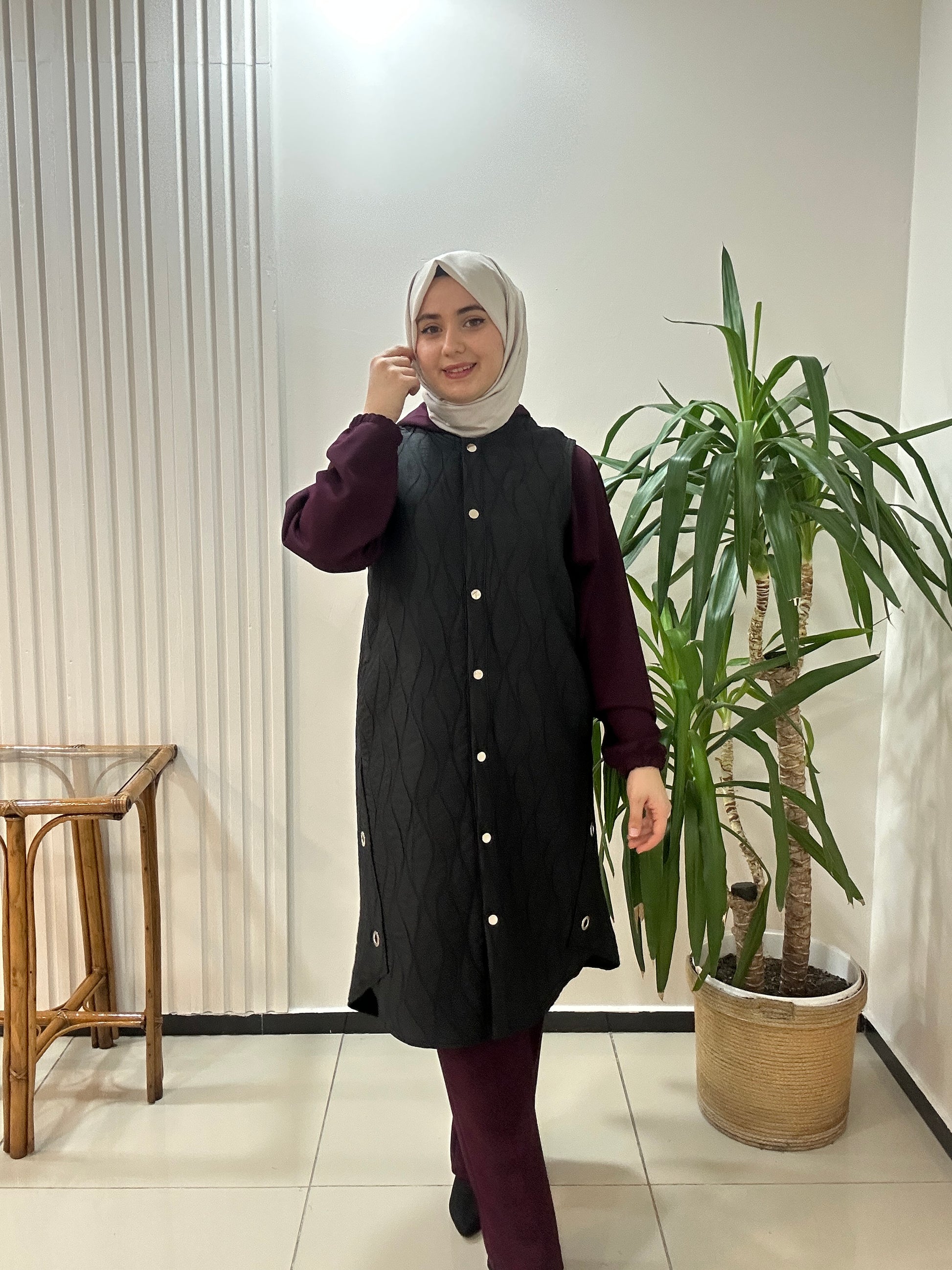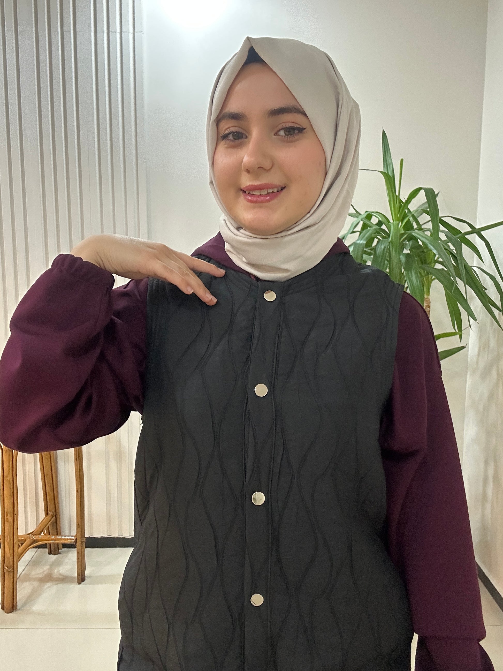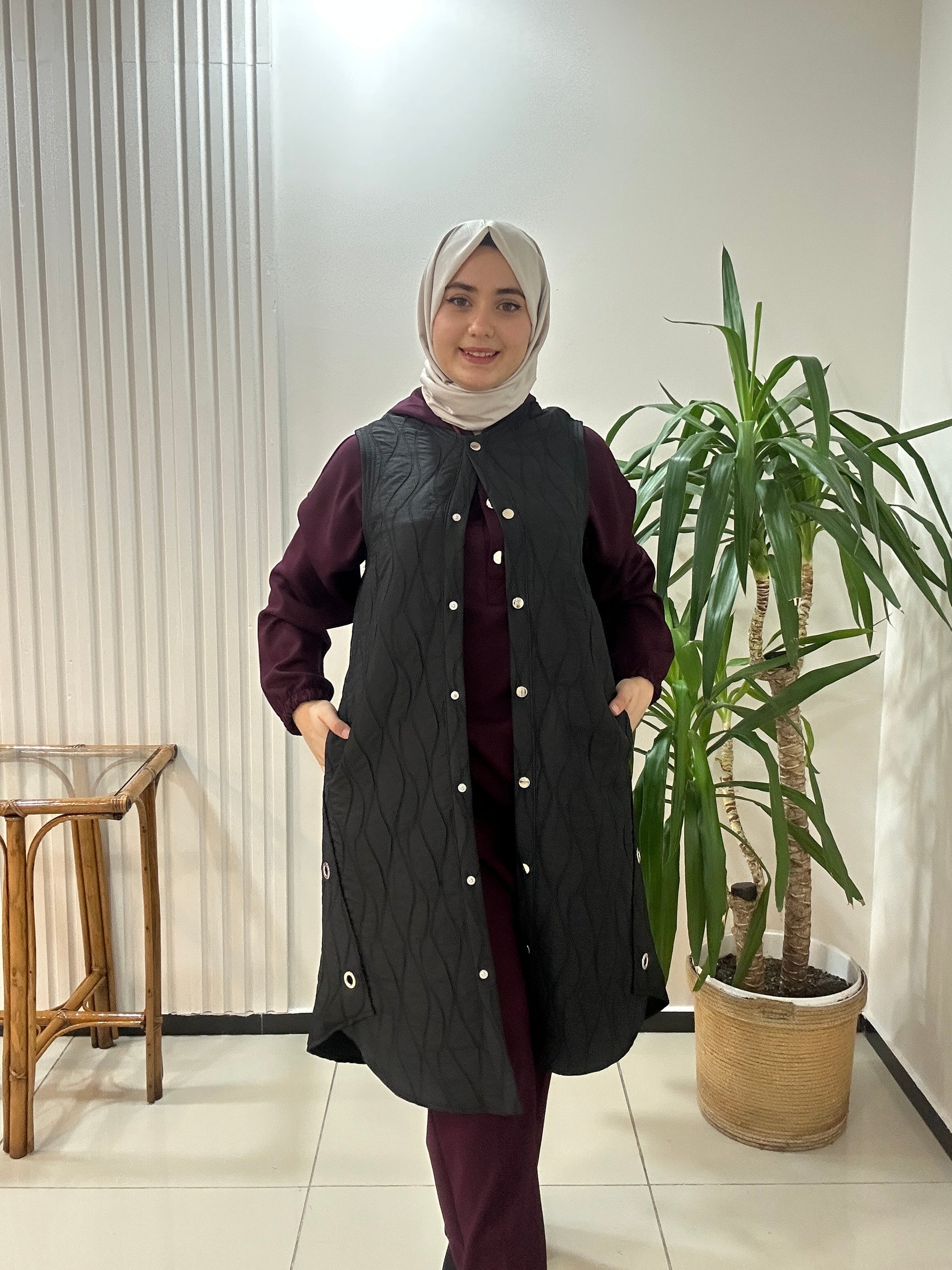 Kaliteli dokuma kapitone yelek clemence marka. Çıtçıt kapama 105cm boyundadır.