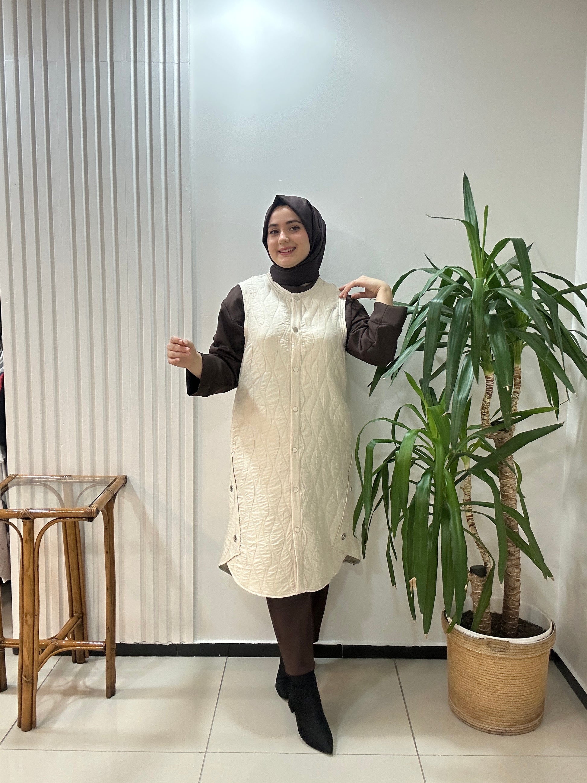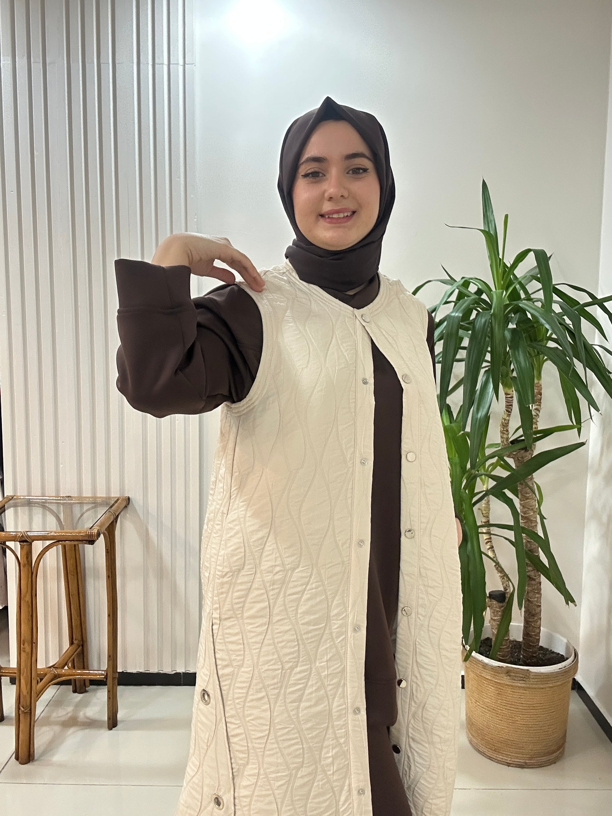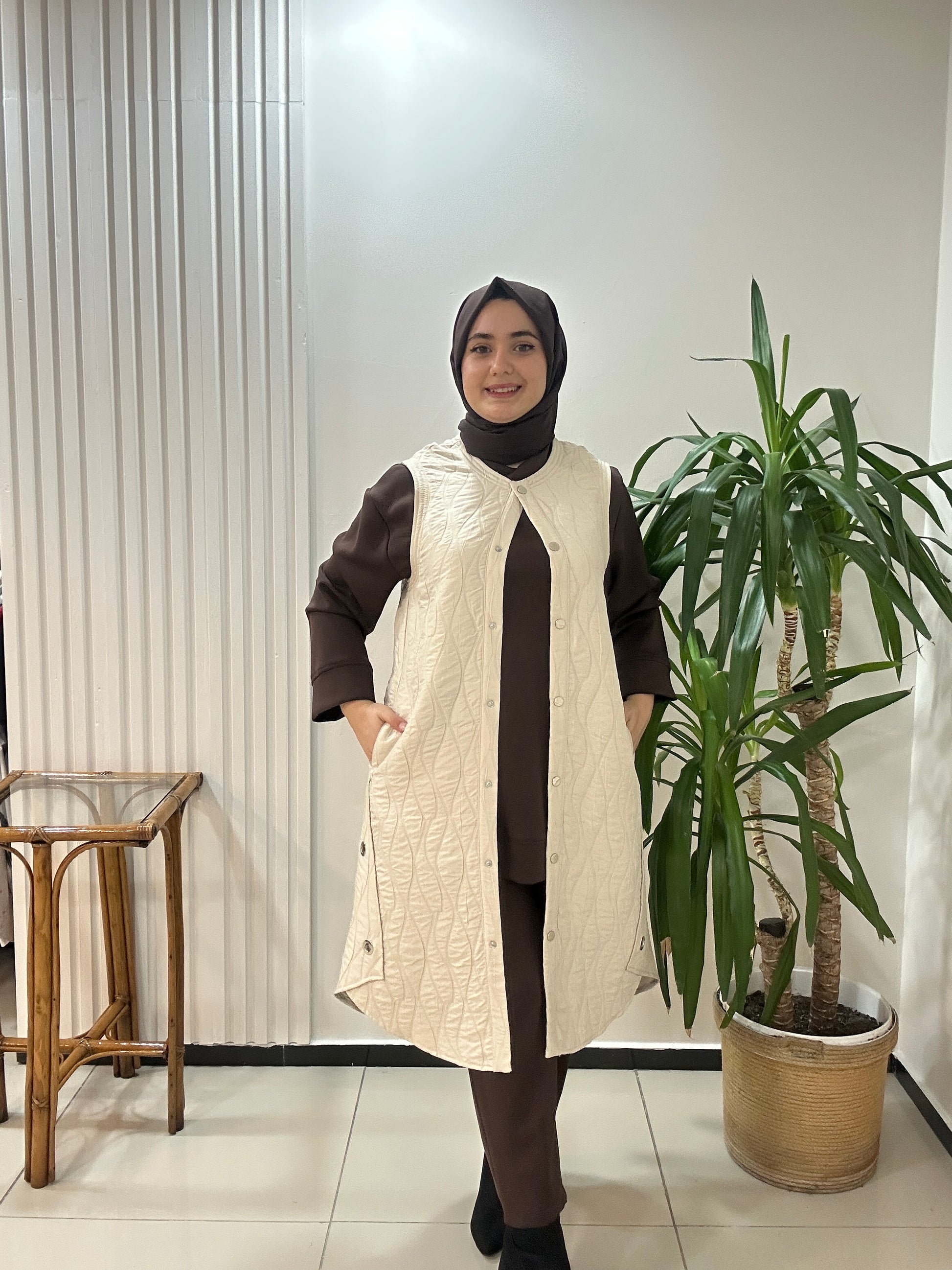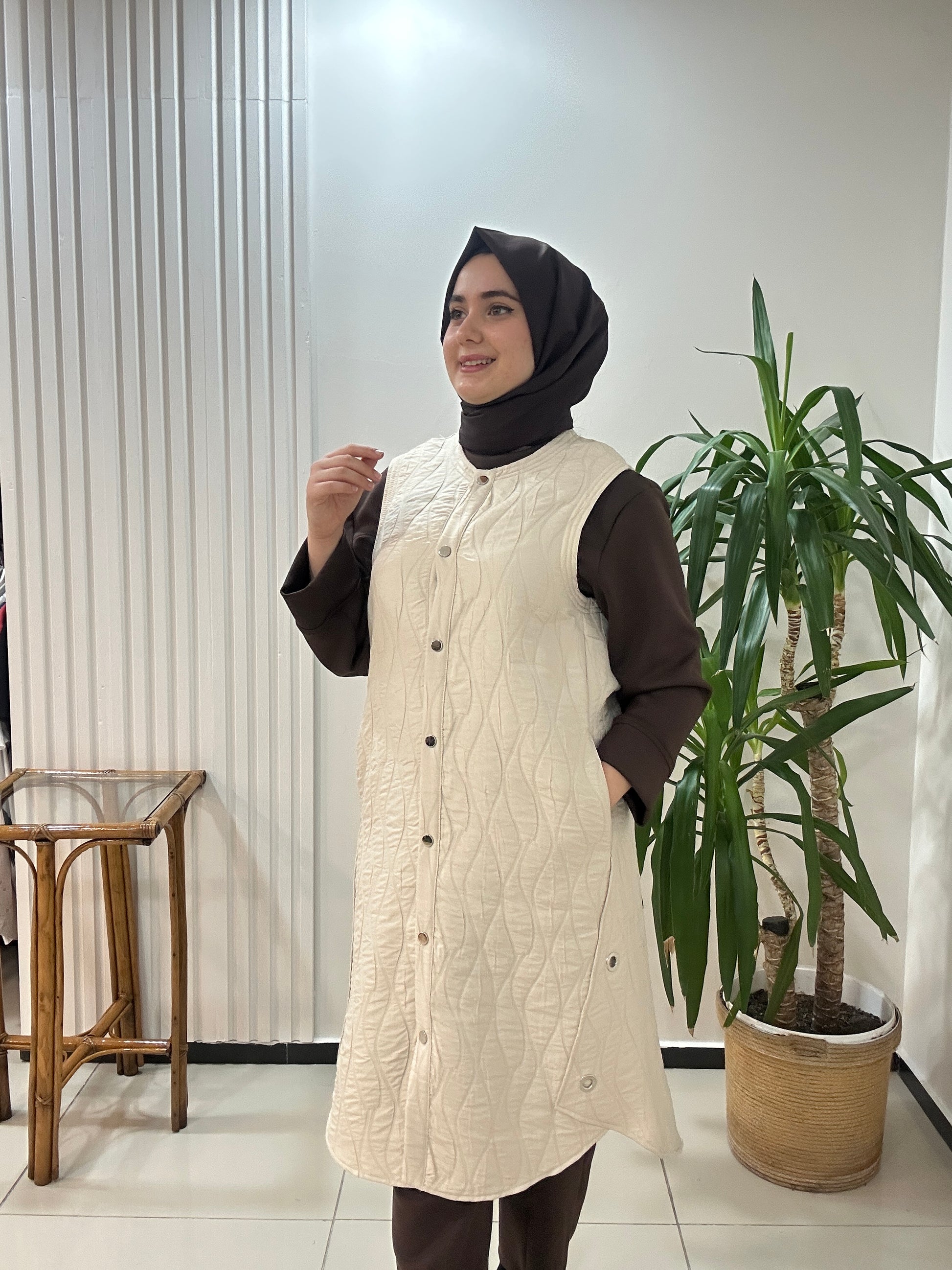 Dokuma Kapitone Yelek Krem Renk
