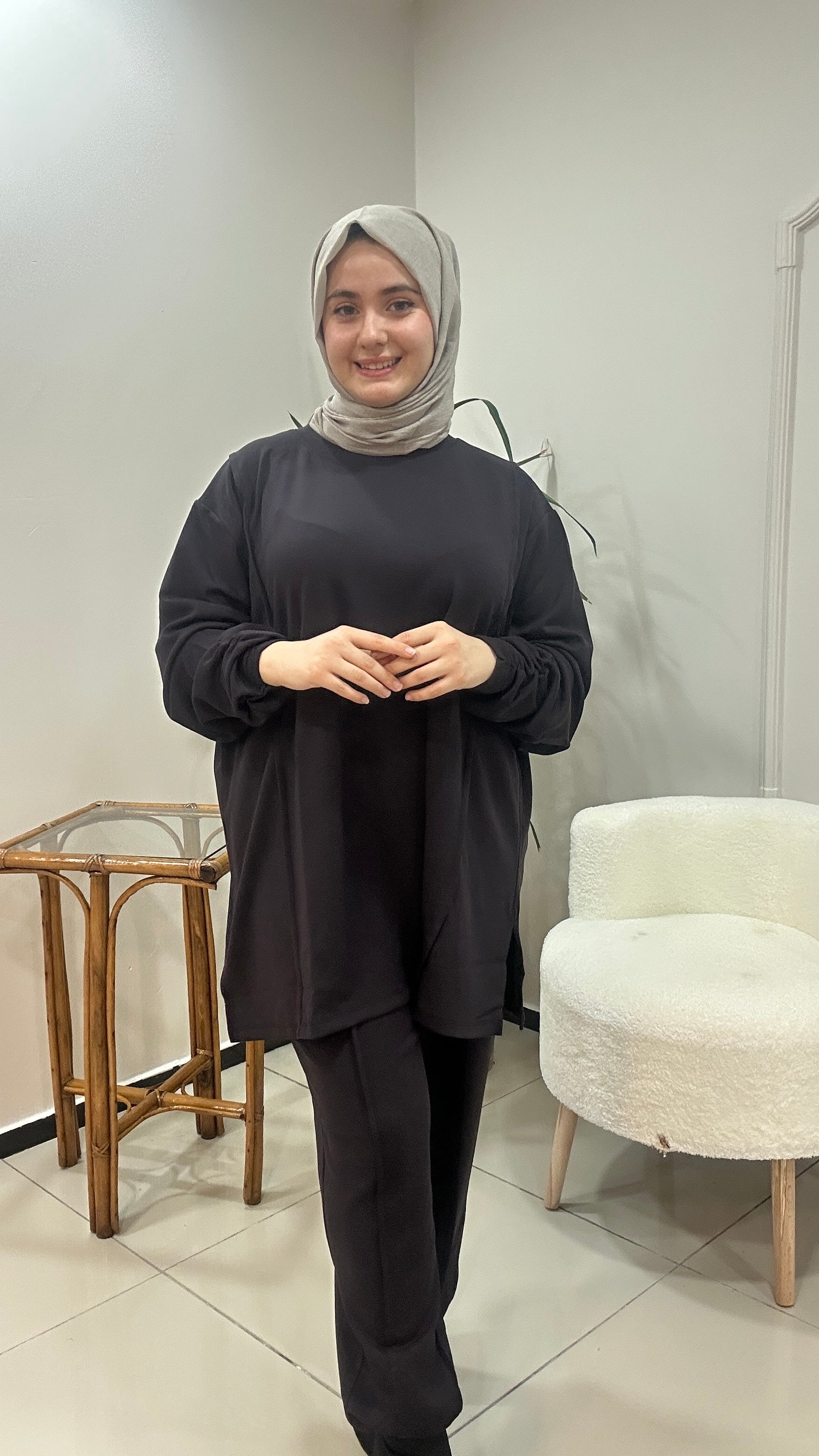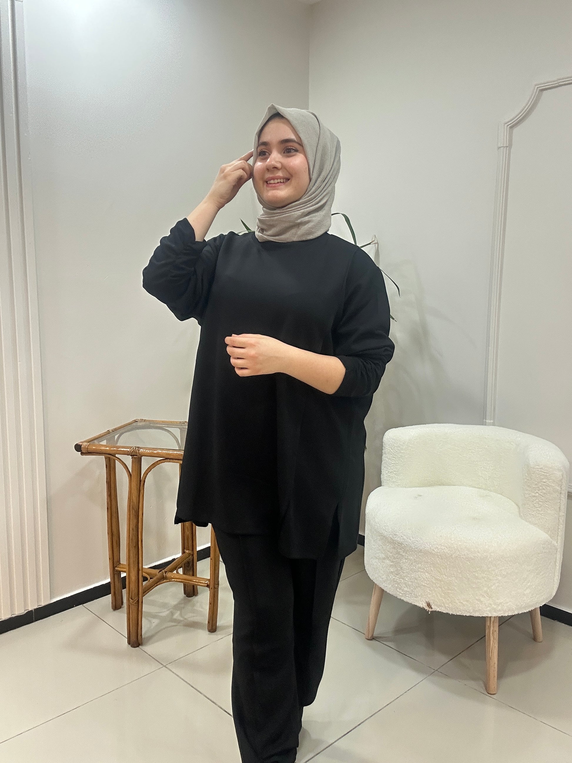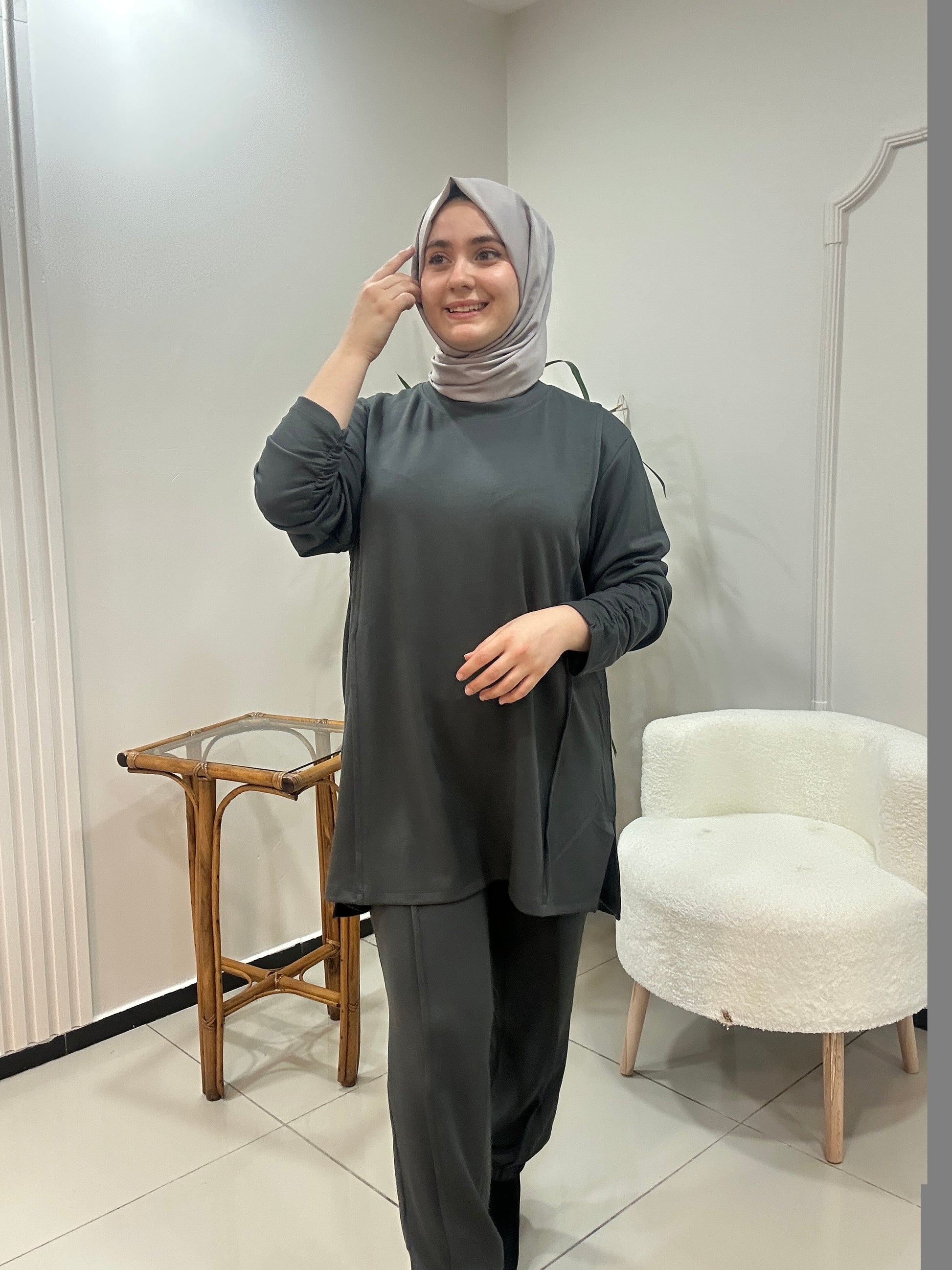 Modal kumaş takım paçası lastikli rahat üründür. Esnek yapısıyla konfor sağlar.Pantolon beli lastiklidir. Kol ağzında büzgü detayı şık bir hava kazandırmış.