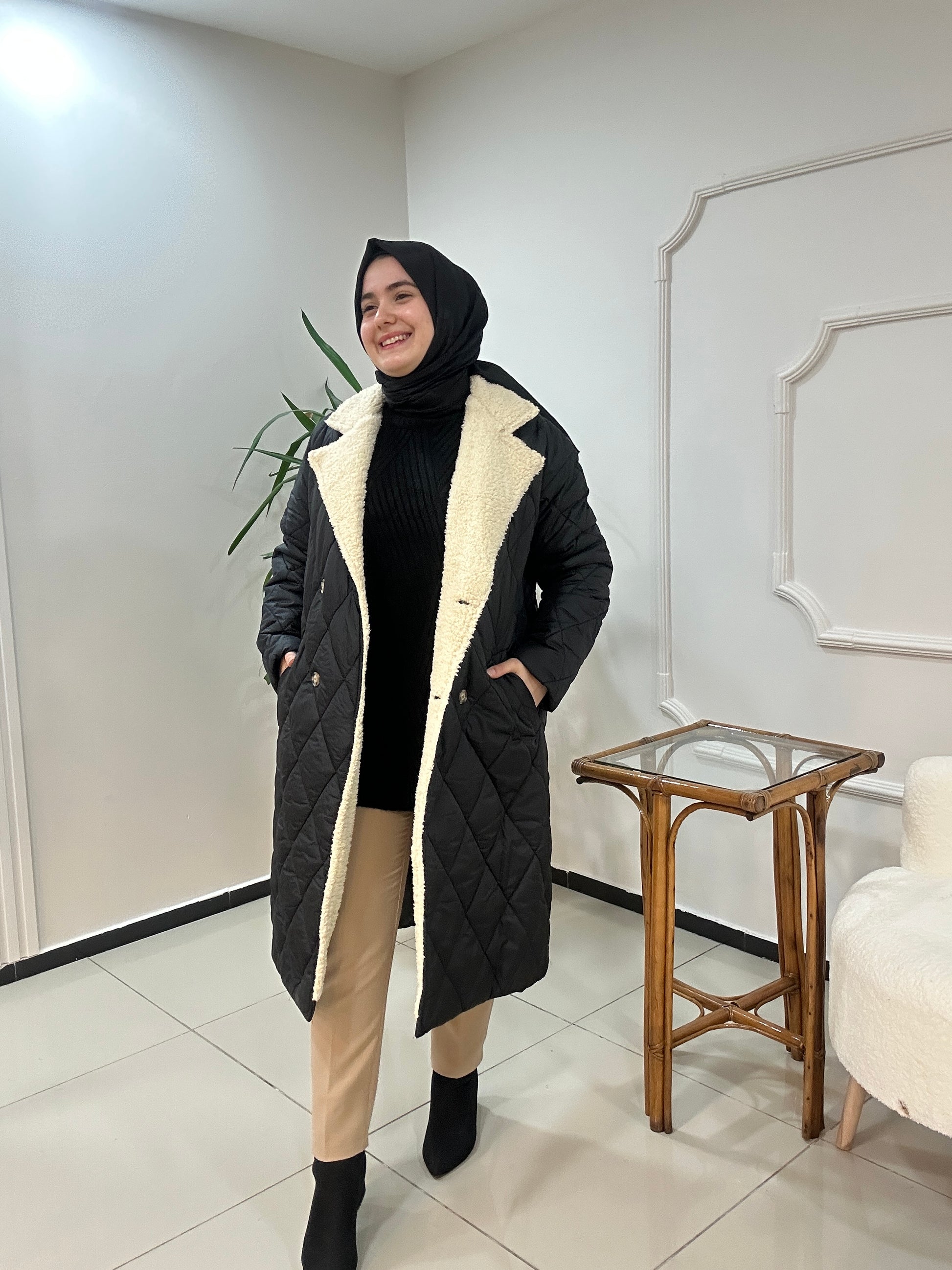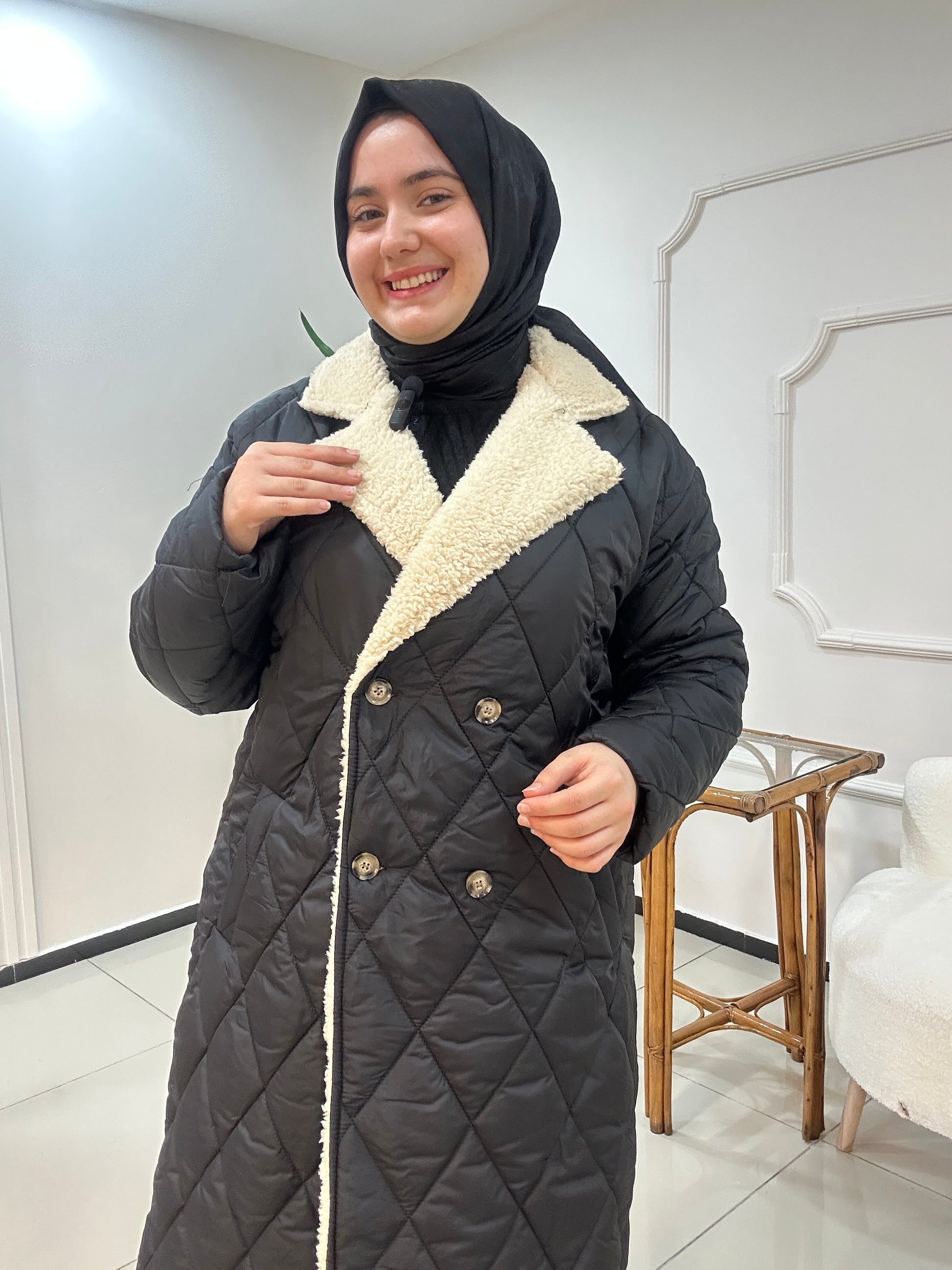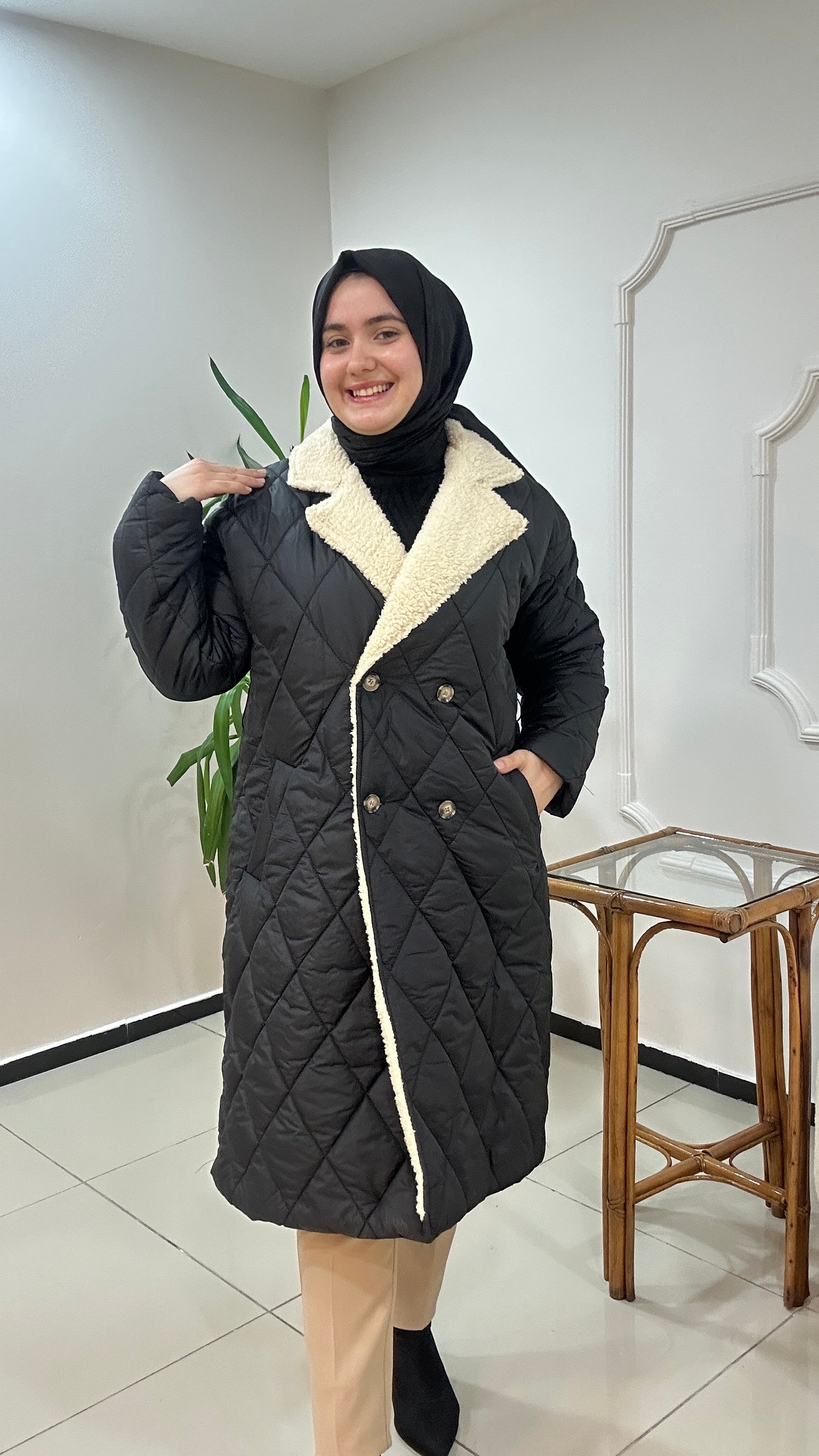 Kapitone kap yakası ve ön iç pervazı kuzu kürklüdür. Geniş kalıp bir beden küçük tercih edin geniş kalıptır
