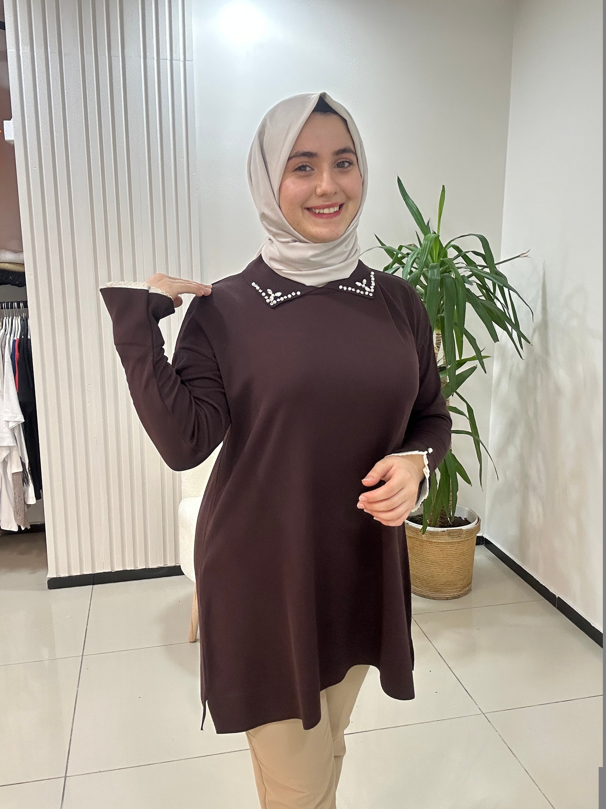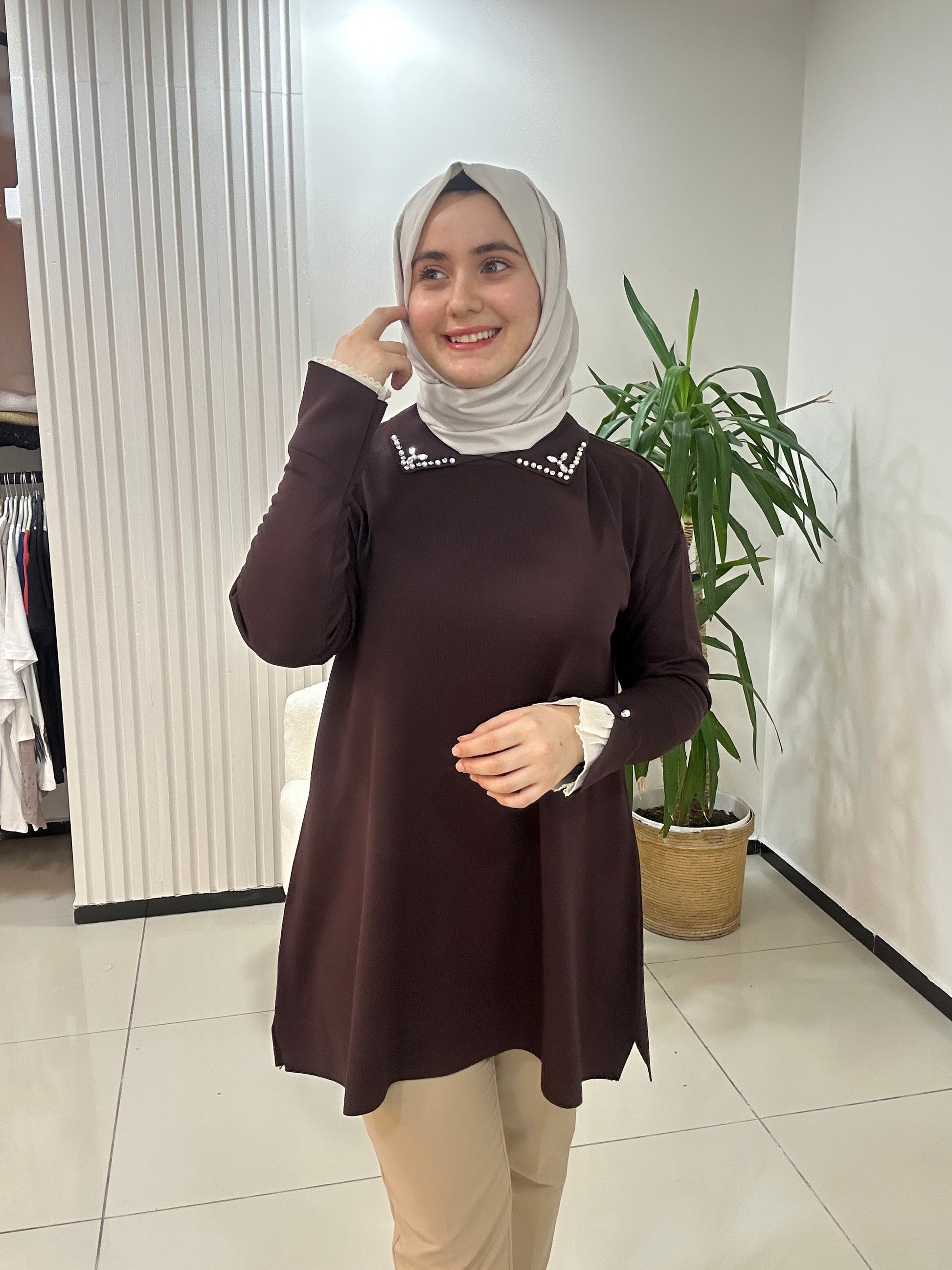 Kol Ucu Dantel Detaylı Merserize Tunik