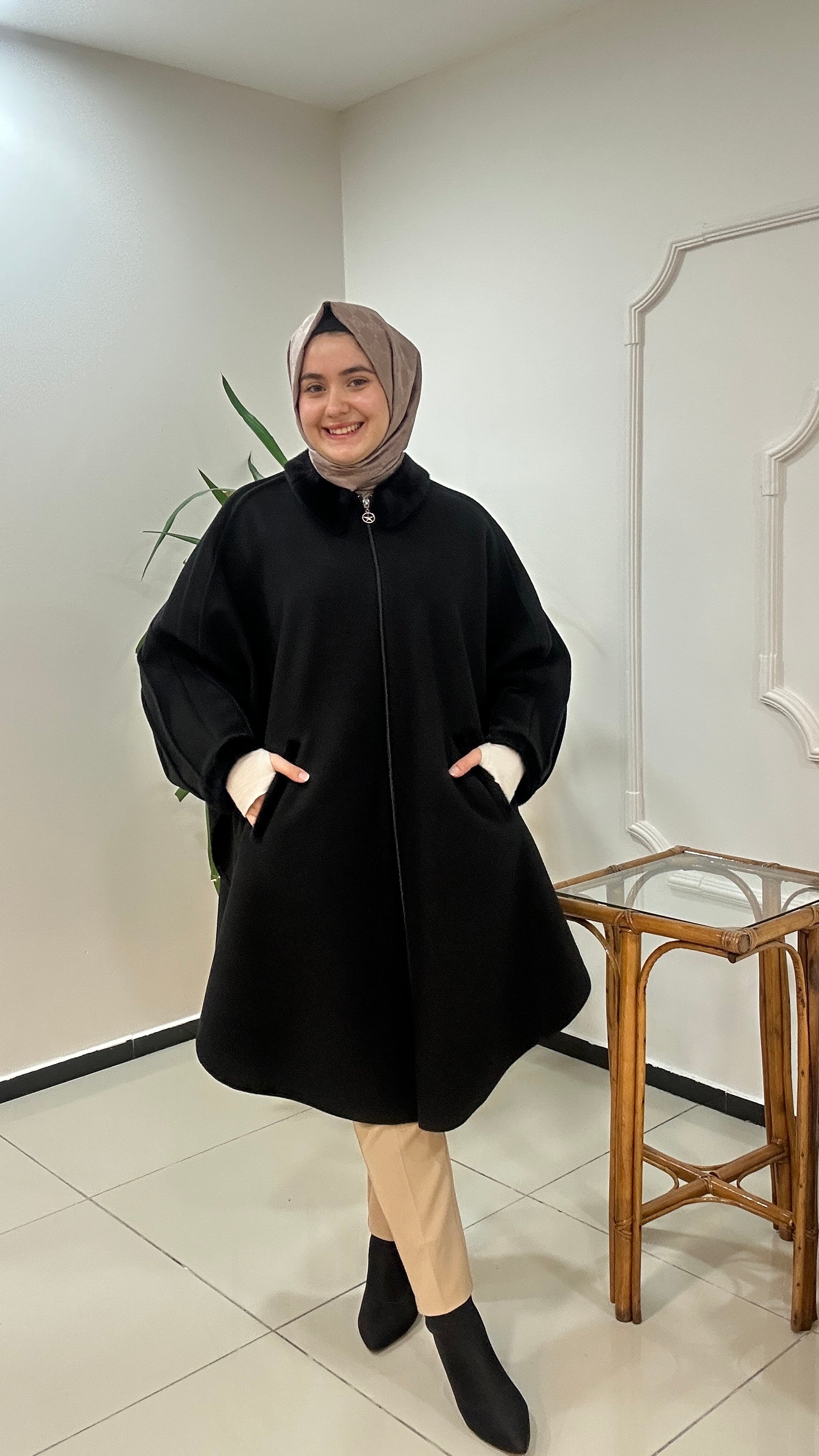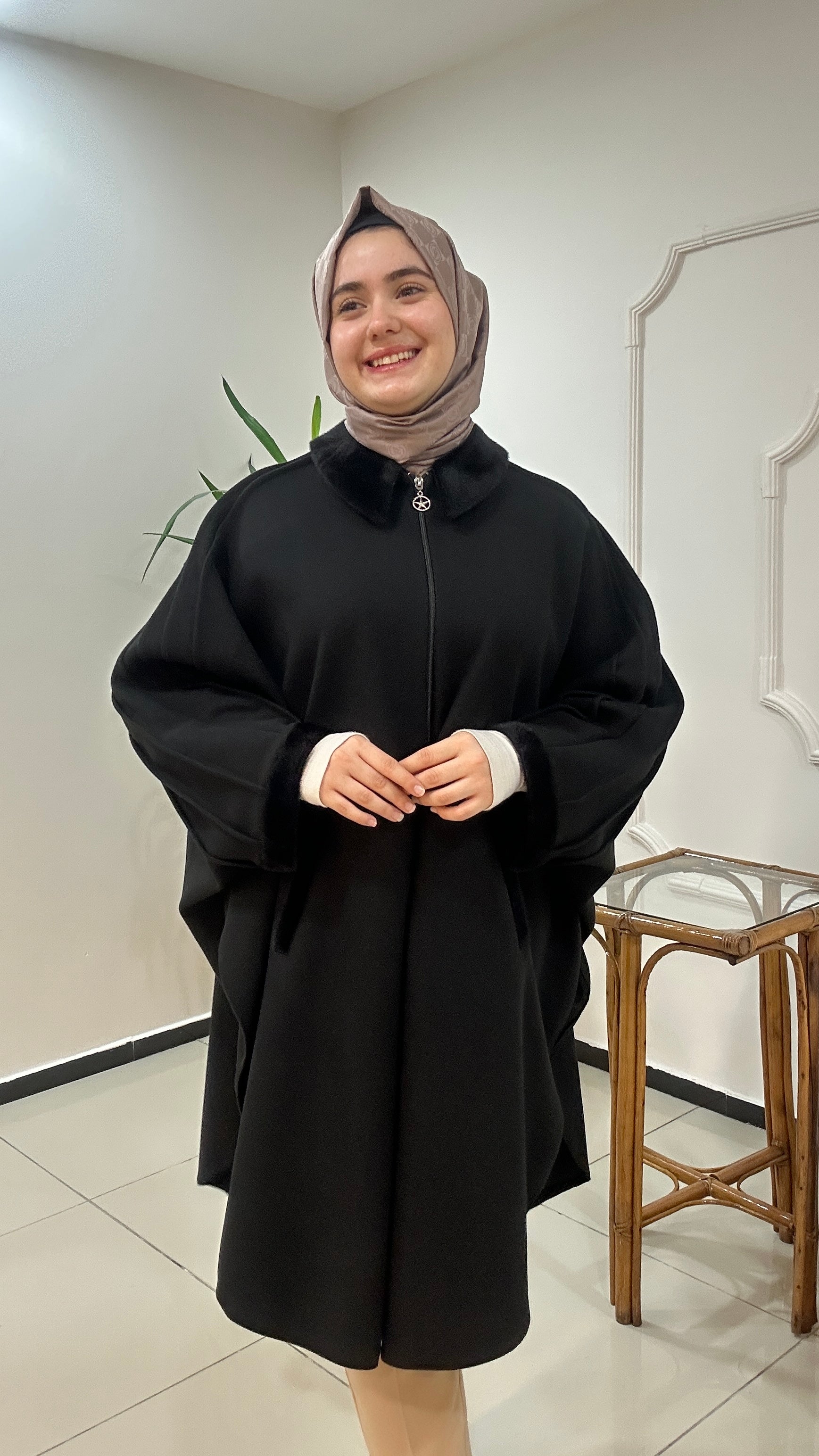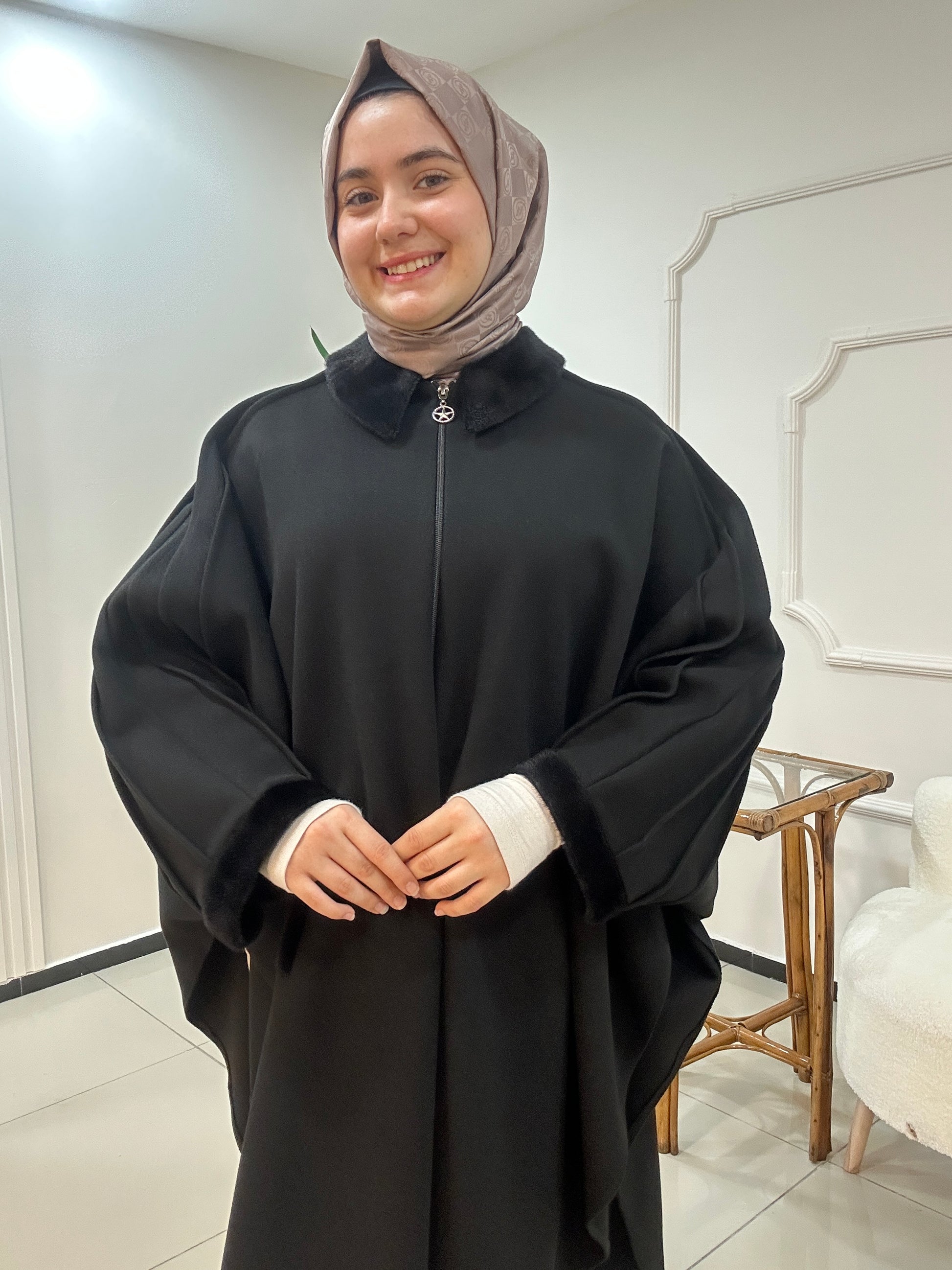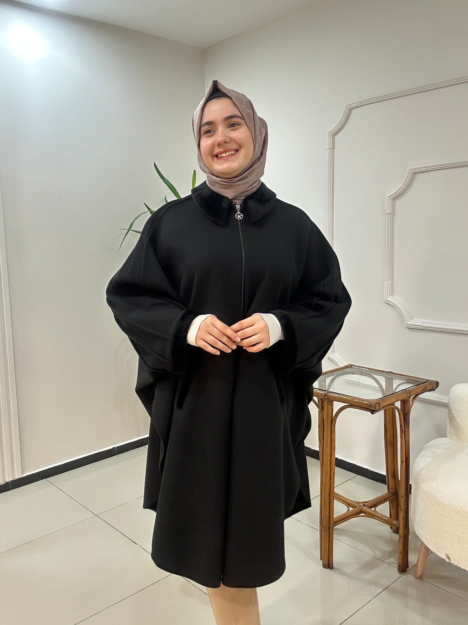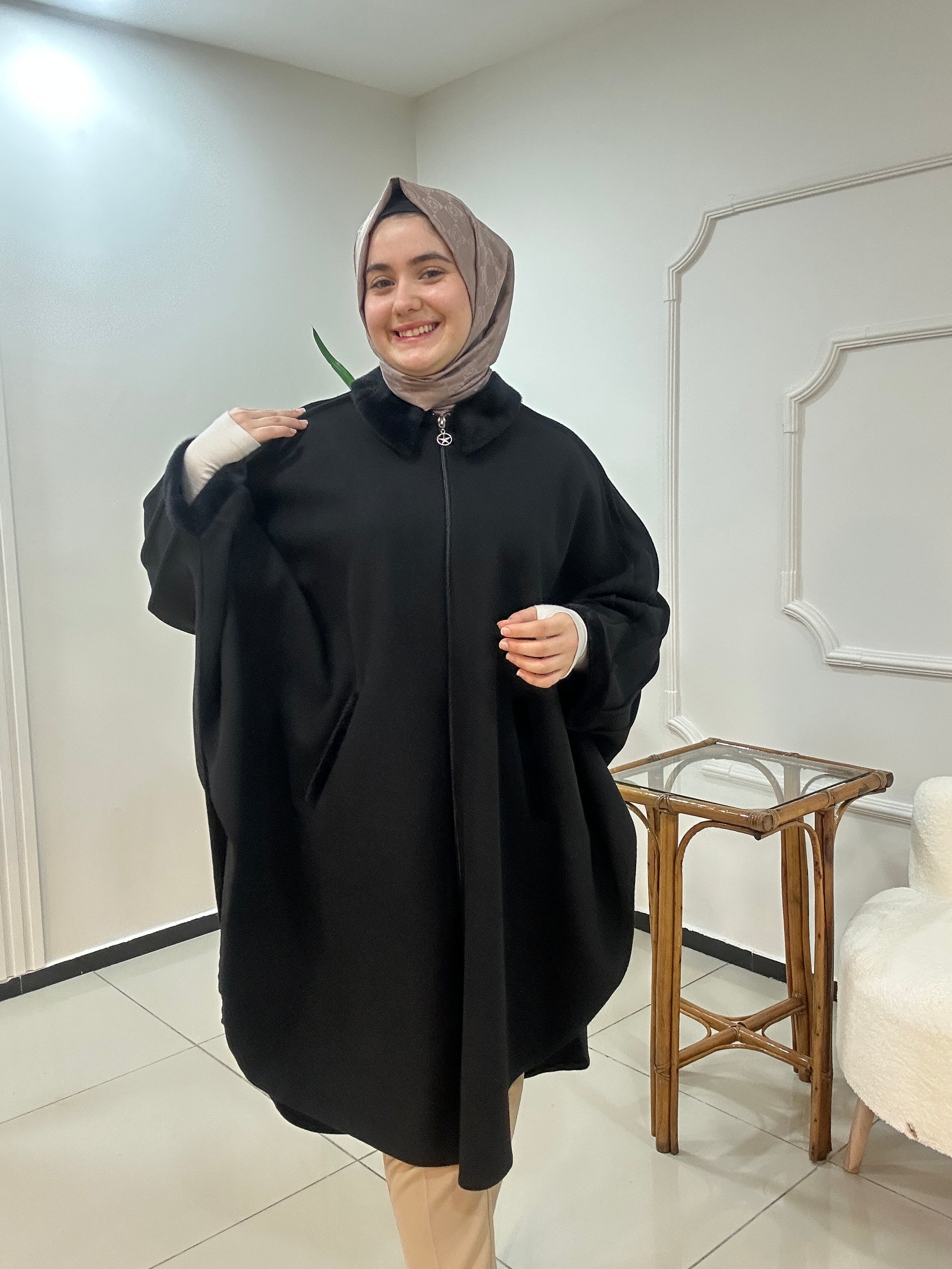 Kaşe kumaştan üretilmiş panço fermuar kapamadır. Yaka kol ağzı ve cep ağızları kürk detaylıdır. Kalitesi ve duruşu harika bir ürün. Std beden geniş kalıp 60 bedene kadar uyumlu