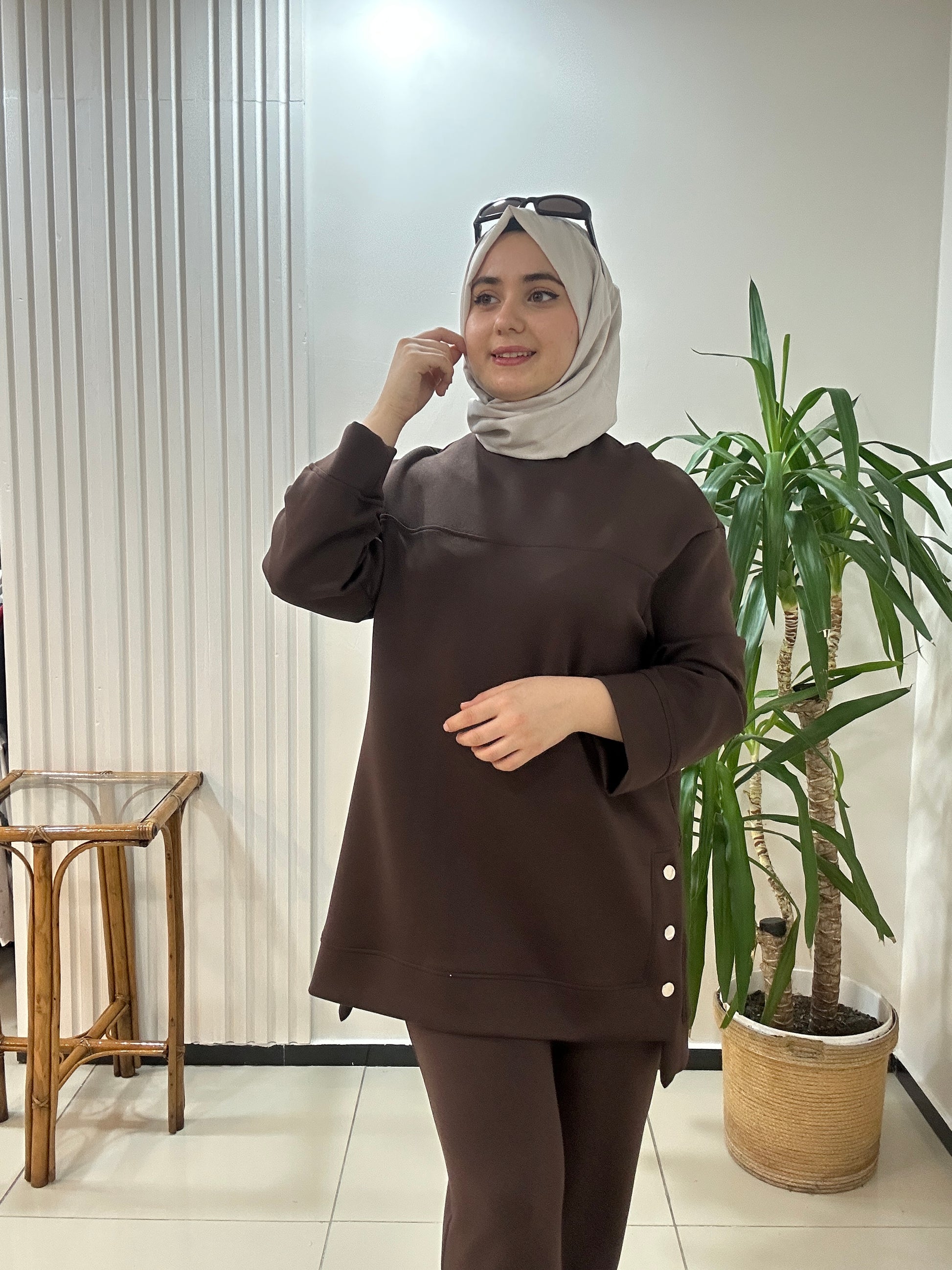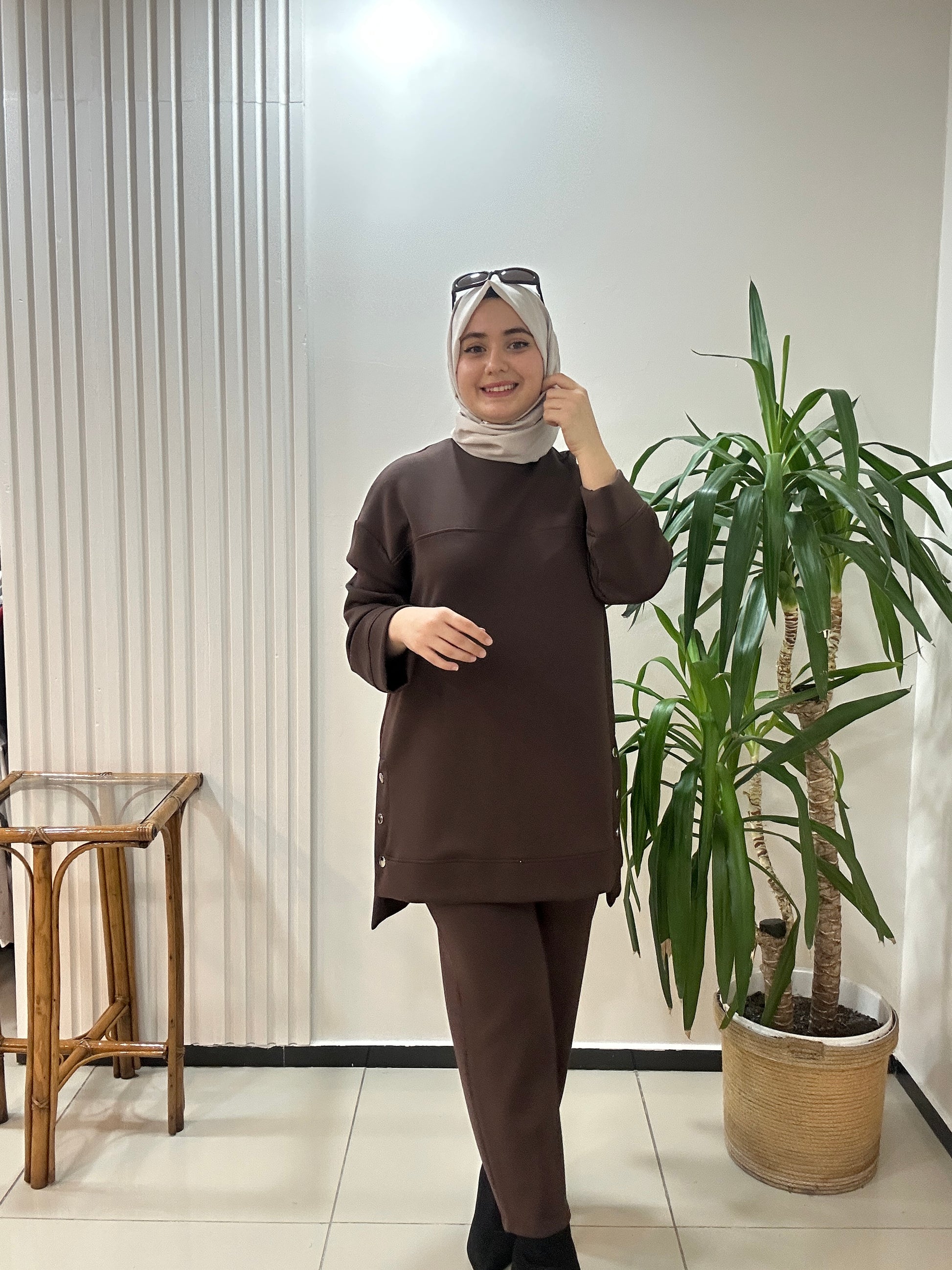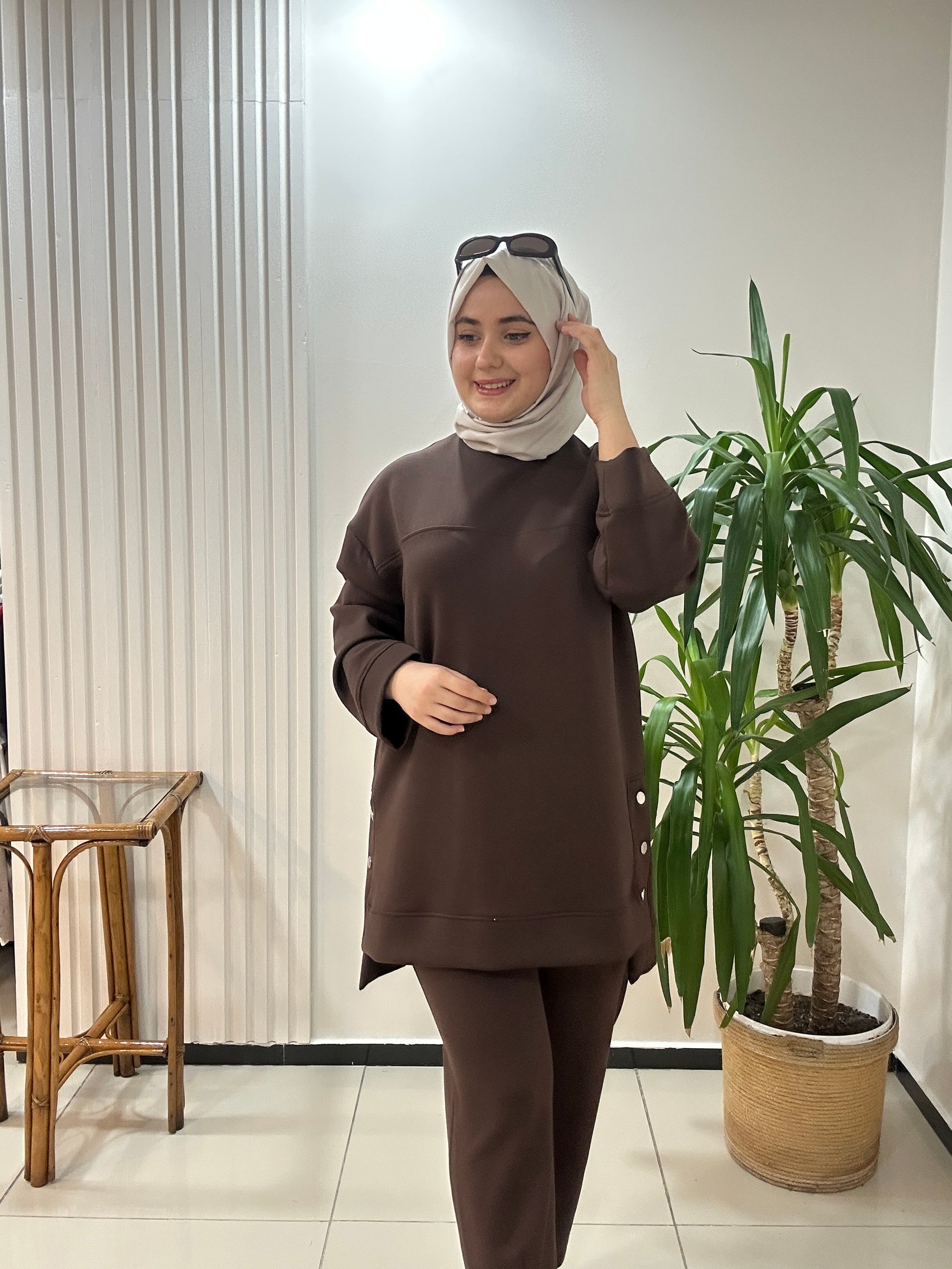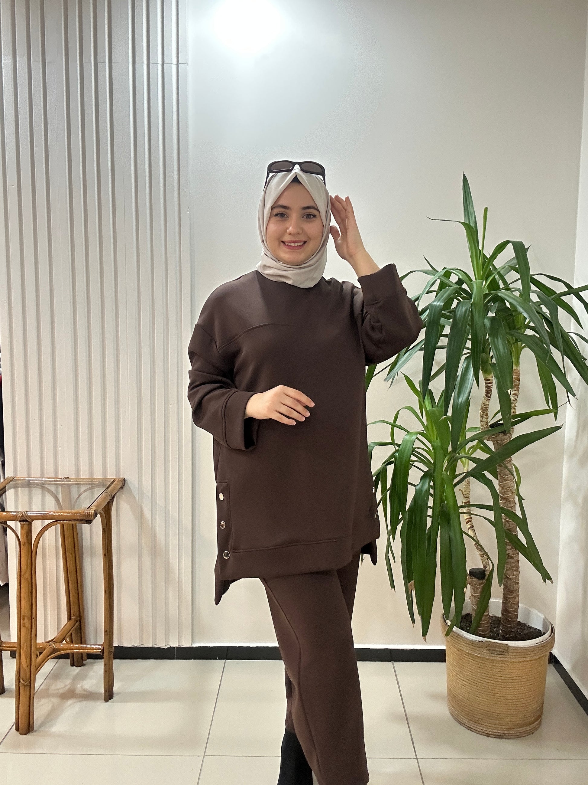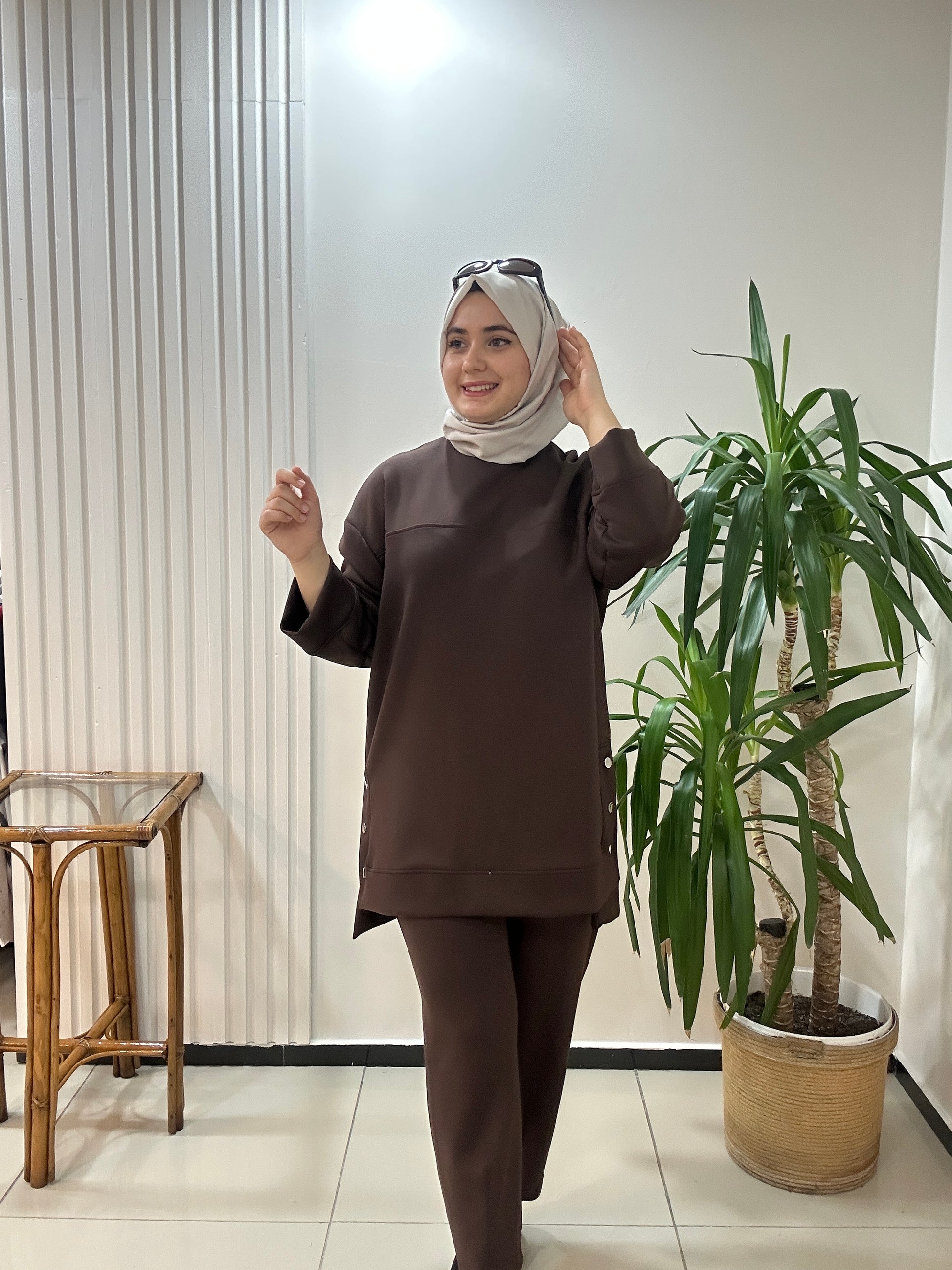 Kaliteli tok modal kumaş. çıtçıtlar açılıp yırtmaç yapılabilir. Pantolon beli lastikli olup paçaları penslidir.
