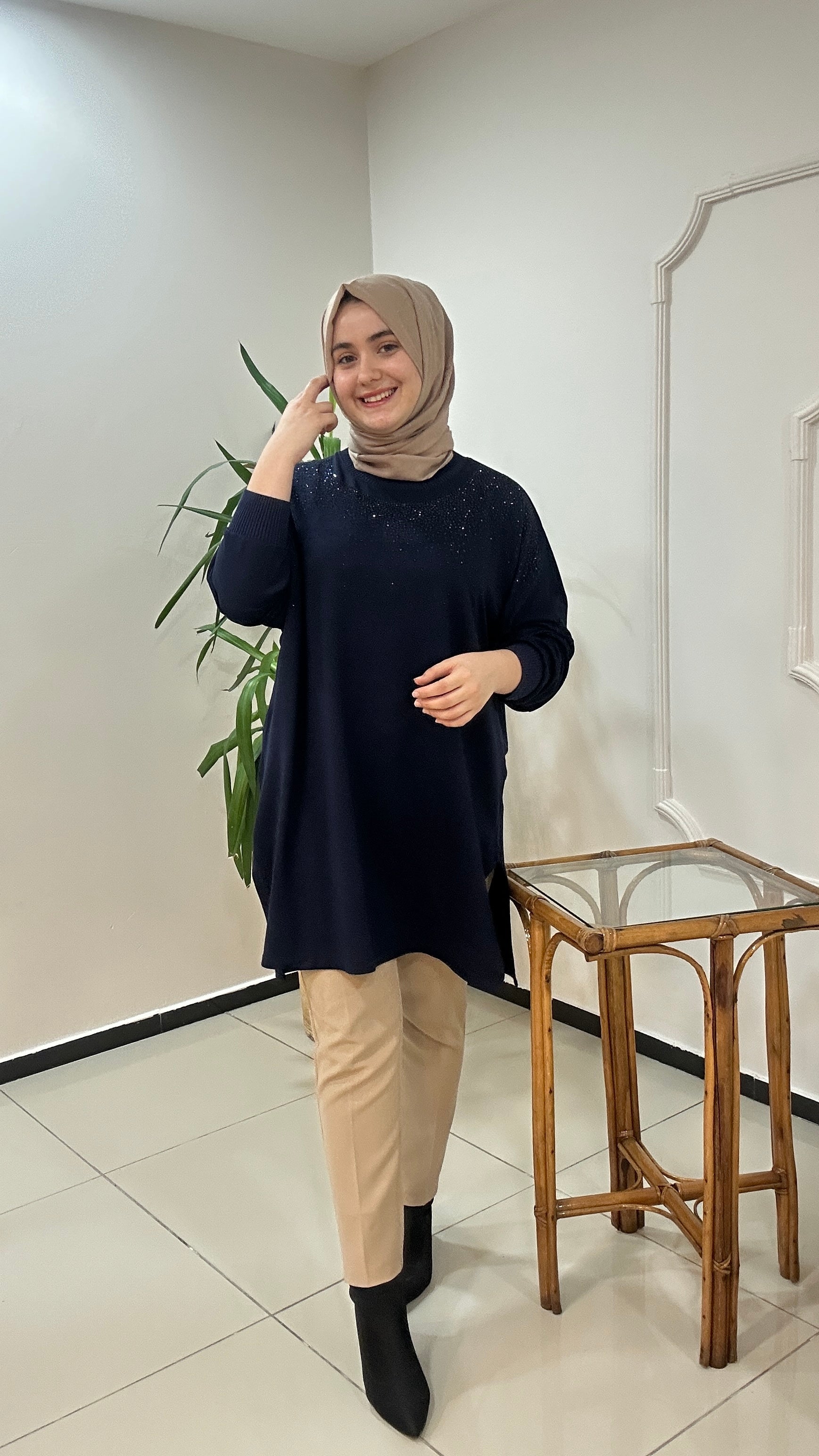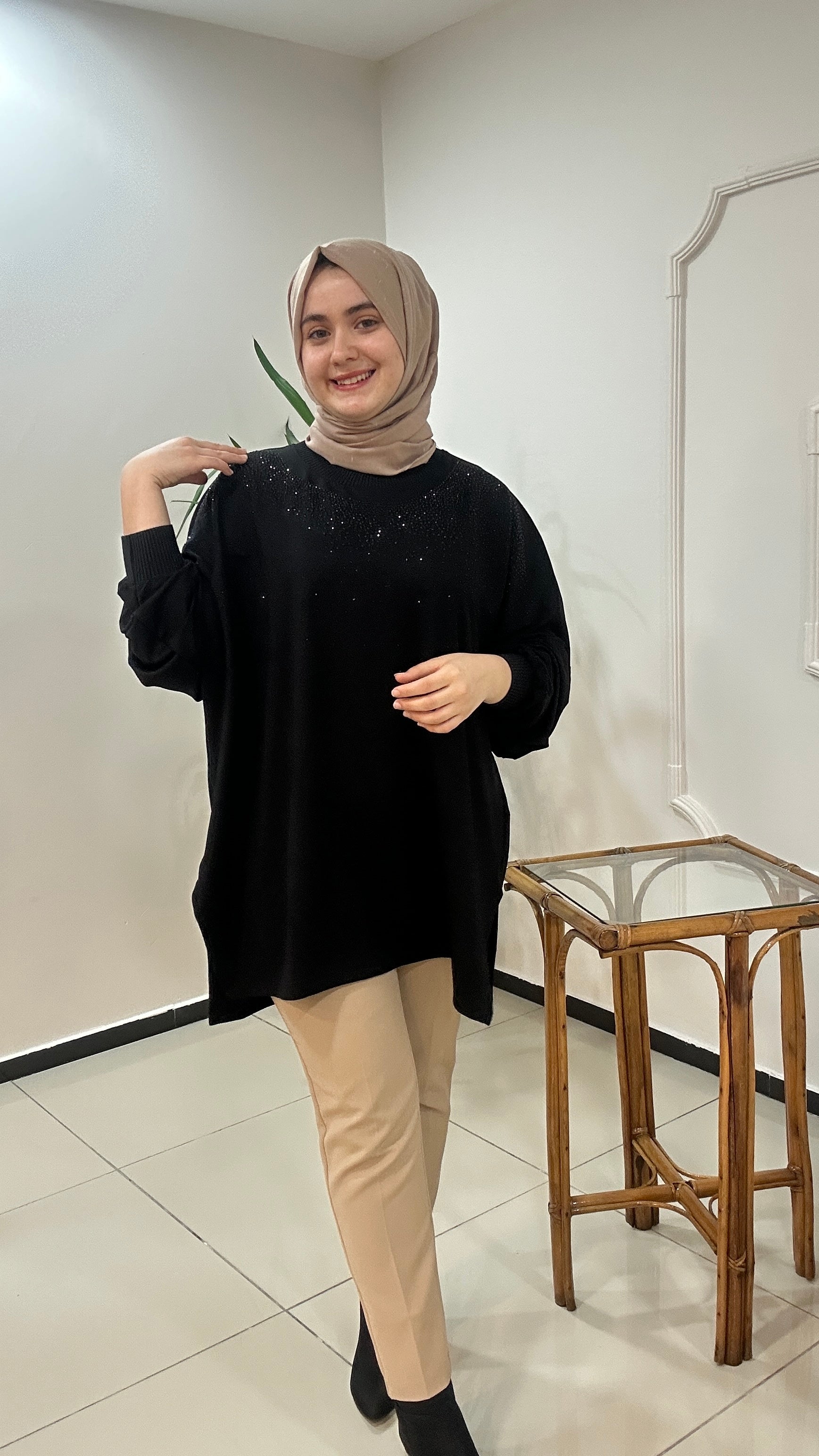 İki iplik viskon kumaş taş baskılı tunik hafif yarasa koldur. Şık salaş kalıba sahip. Yıtrmaçlı tarz bir ürün.