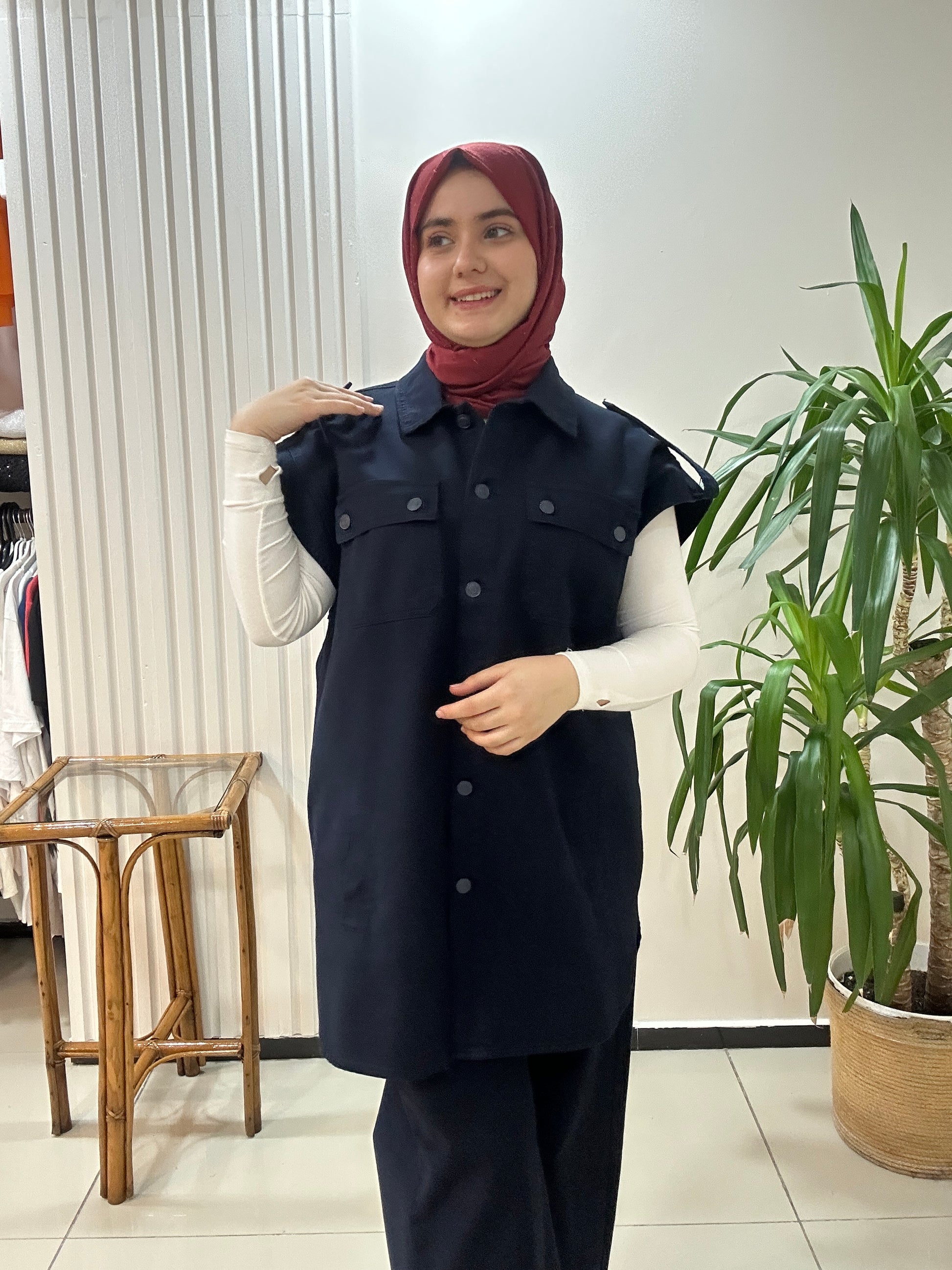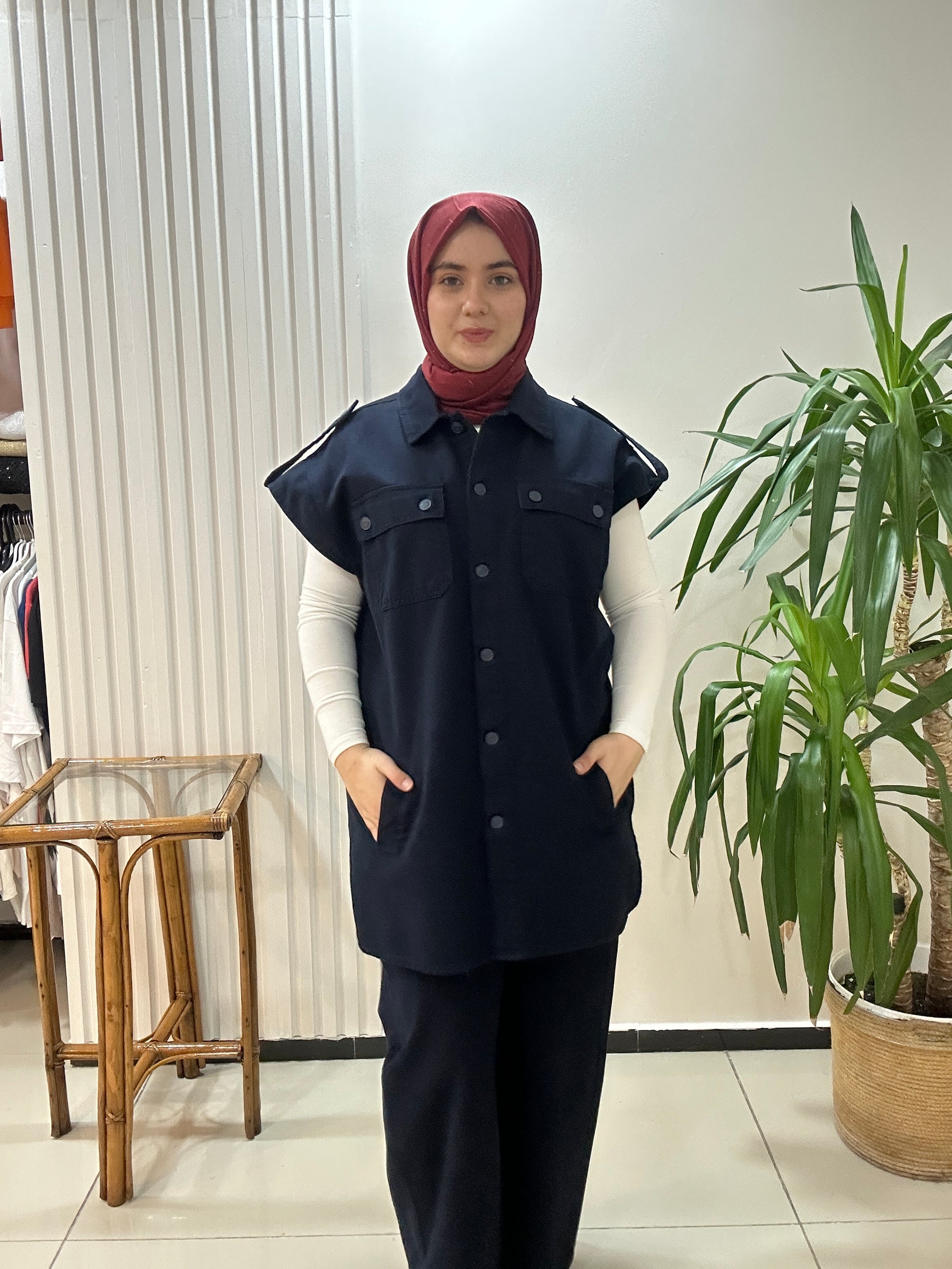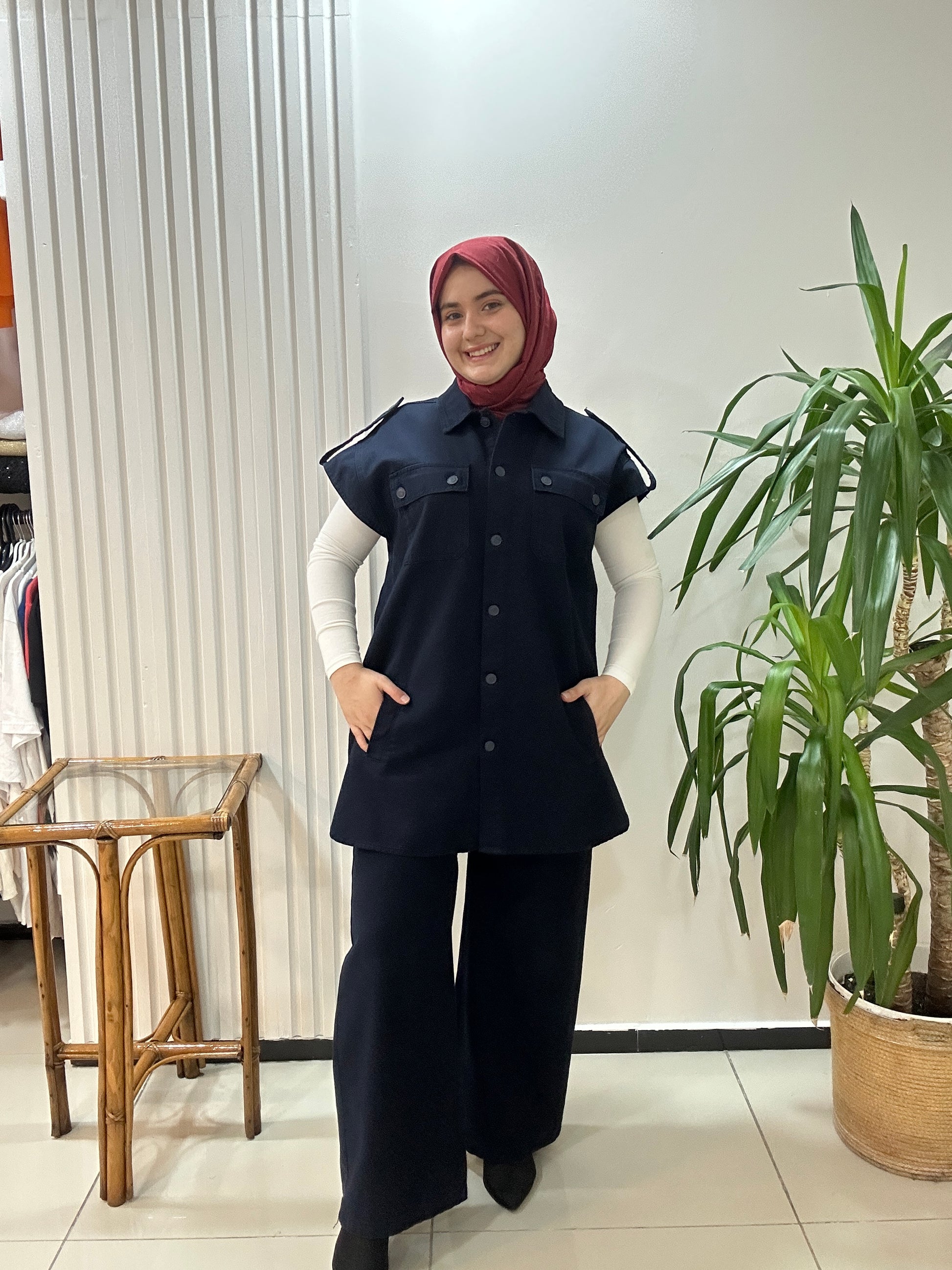 Kot kumaşıyla spor bir takım. Pantolon bol kesim beli lastikli.